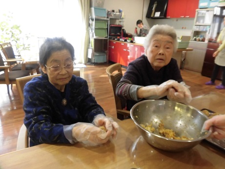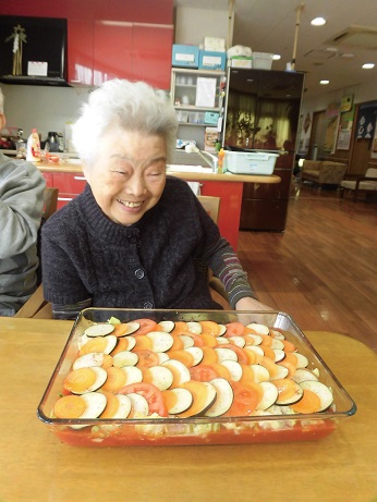 ちょっと変わった食事レクレーションを行いました!ご飯を丸くおにぎりにしてカレーをかけたタワーに、キャベツまるまる一個使ったロールキャベツ(?)、色鮮やかなオーブン焼き。とちょっと変わった料理を作りました☆皆さま和気あいあいと“どんなのが出来るんだろ~”と楽しみに作られていました♪