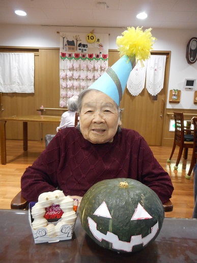 ご家族様にカボチャをいただいたので、ジャック・オー・ランタンに見立て、とんがり帽子もかぶって、ハロウィン気分満載でおやつのドーナツを楽しみました♪