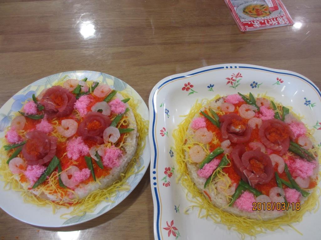 酢飯を混ぜたりゴマをすったり、皆様それぞれに役割分担して頂き、少しずつ形が出来上がっていきます。仕上げに錦糸卵や桜でんぶを散らしたら…ケーキそっくりなお寿司が完成!美味しそうに出来ました☆