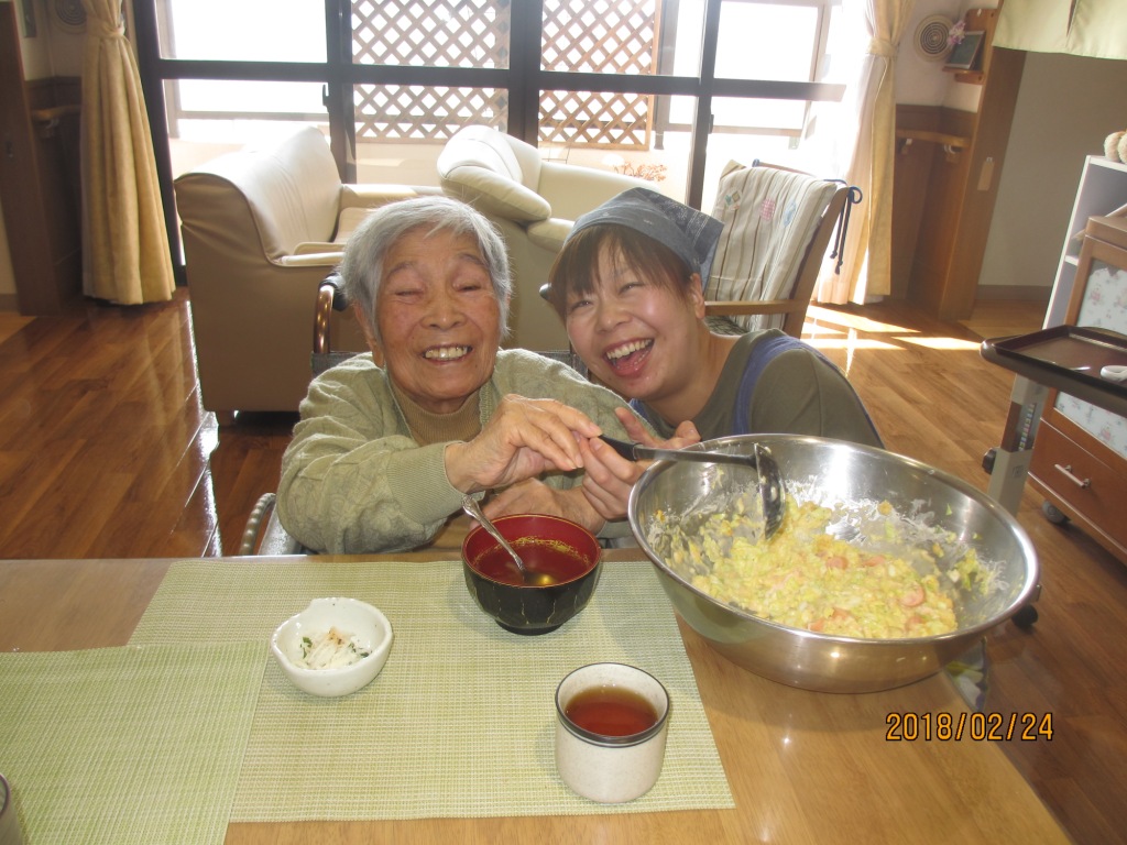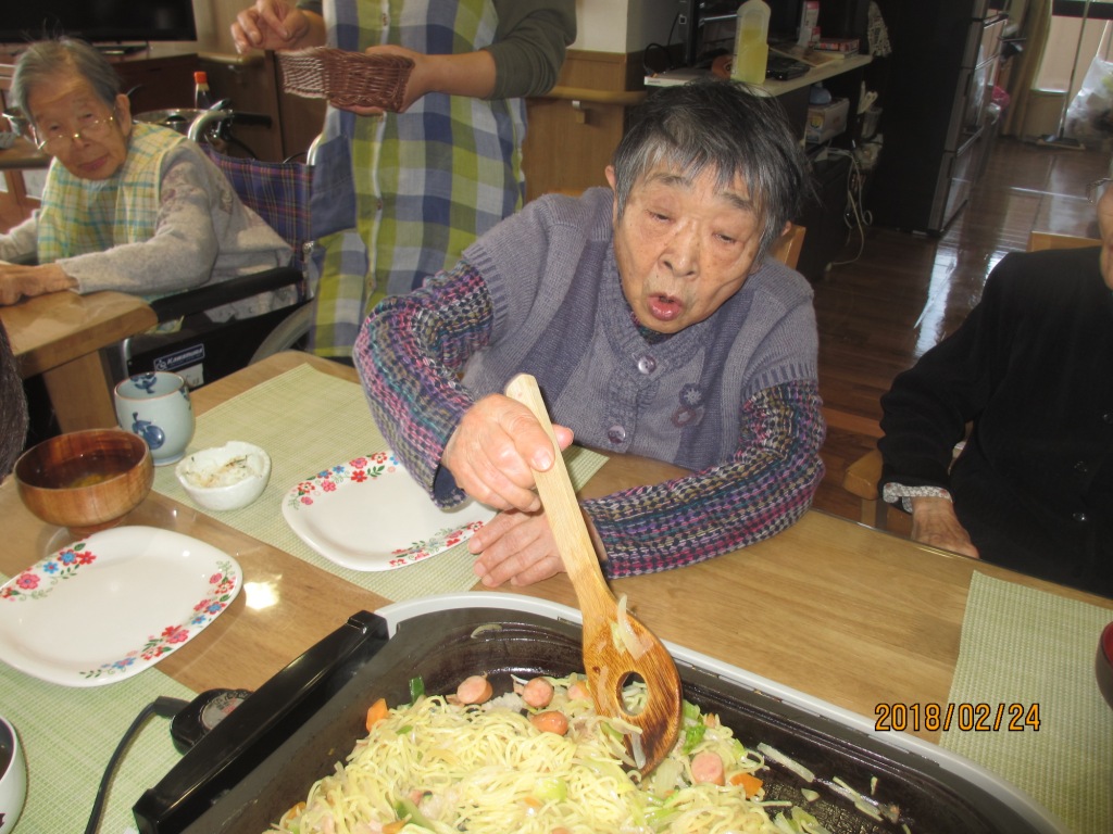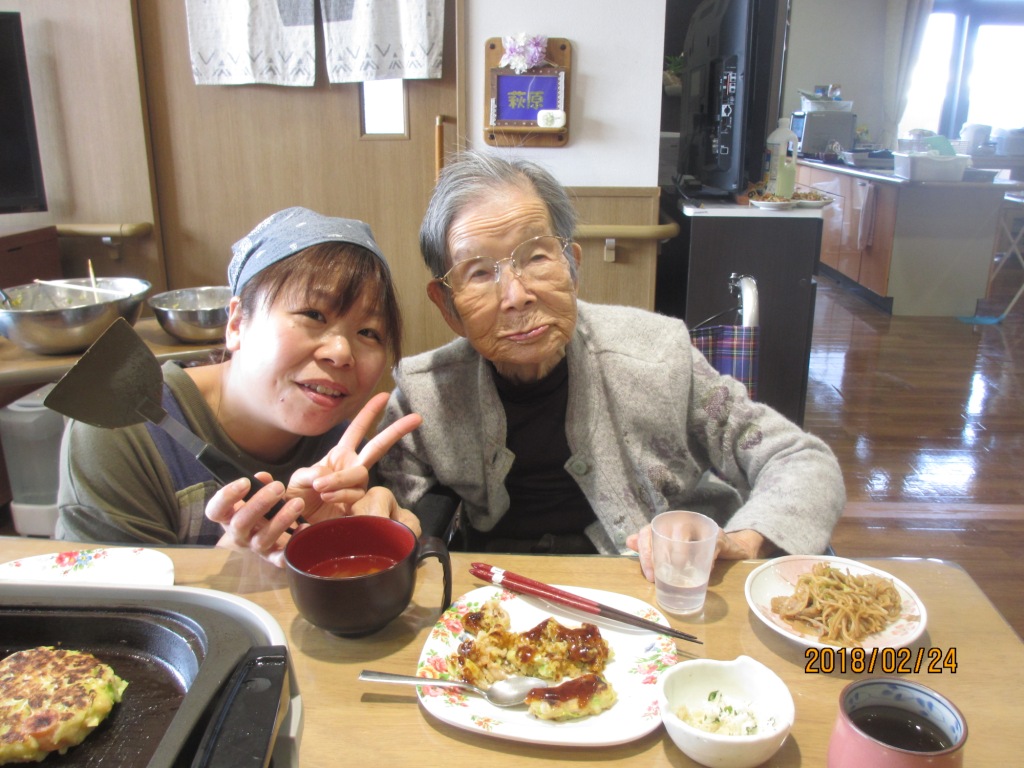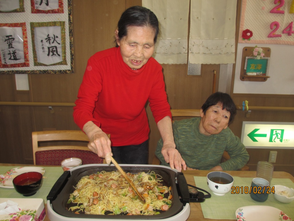 本日の昼食はホットプレートを用意して…お好み焼きと焼きそばを作ります☆それぞれ、お好み焼き班、焼きそば班と担当を分けて、昼食作りに取り掛かります♪部屋中に香ばしい匂いが広がって完成♪どちらも美味しく、完食したのでした☆