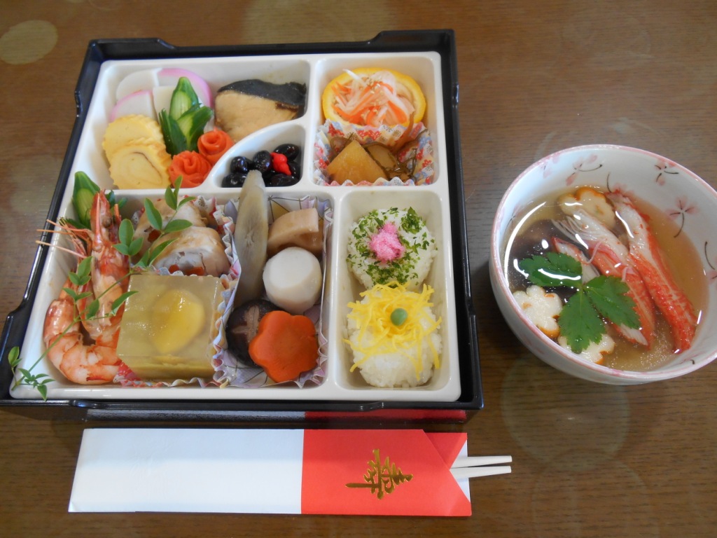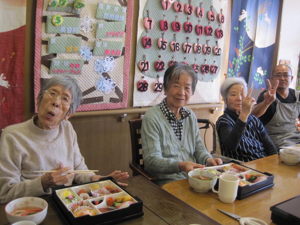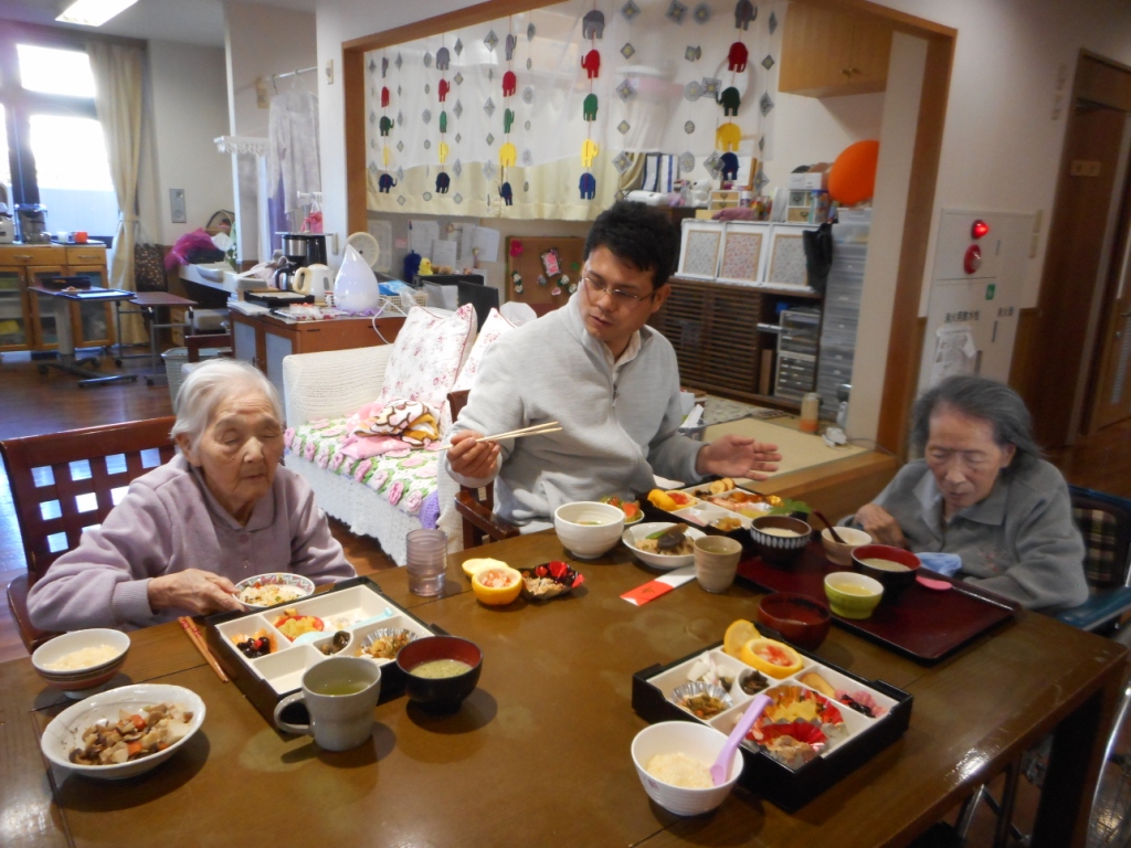 今年も、手作りおせちを作りました♪皆様と一緒に新年を祝いながら堪能しました!食後には、グループホームの前の角松と一緒にパシャリと☆