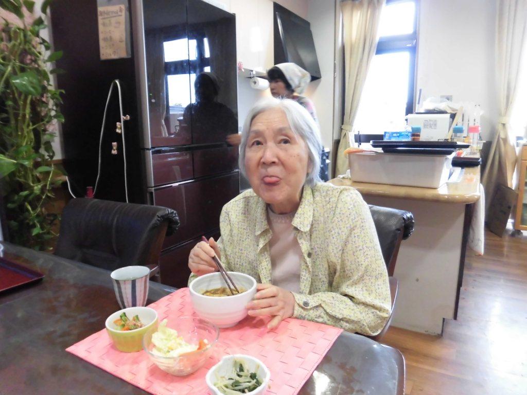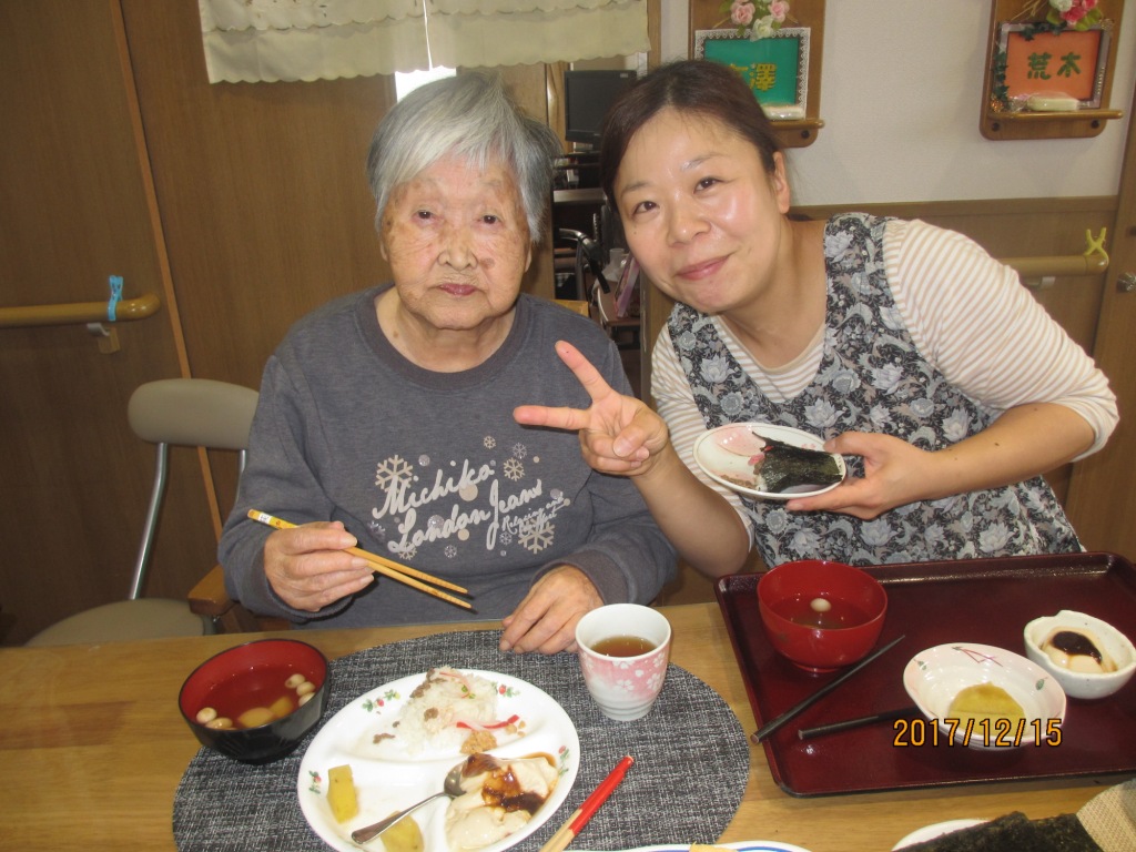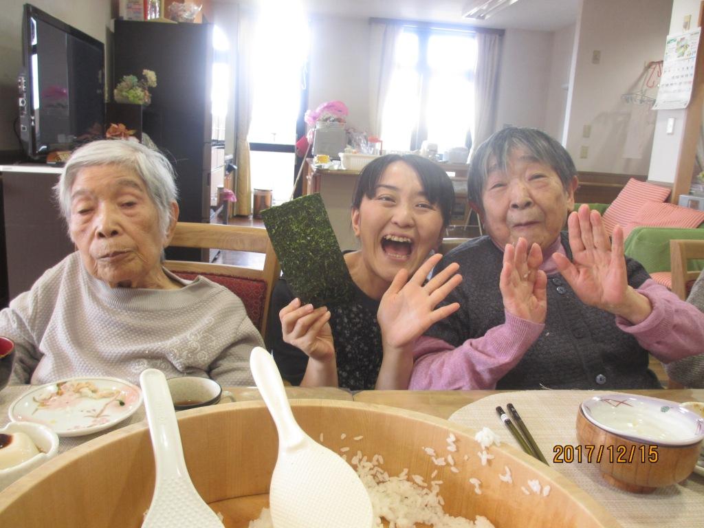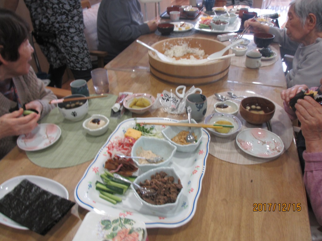 今日の昼食は、『手巻き寿司』です!!皆様、目の前の好きな具材を沢山詰め込むと・・・太巻きの様な大きな手巻き寿司が出来ました☆次々と頬張って、笑顔で楽しく堪能しました♪