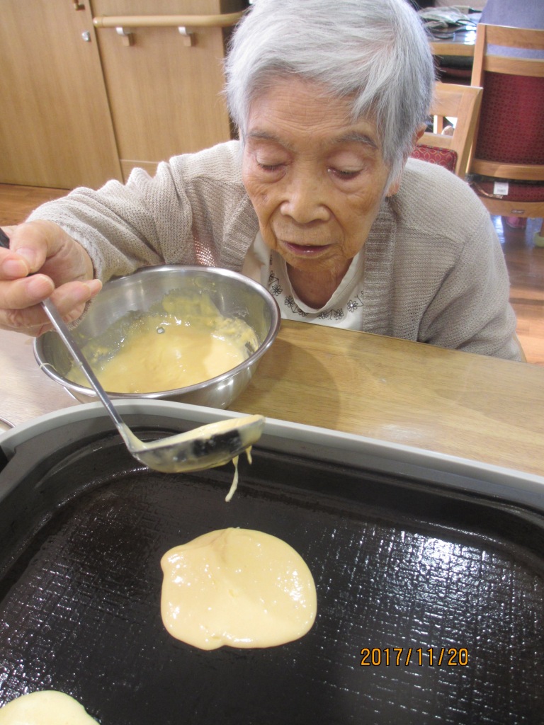 今日のおやつは『手作りどら焼き』です☆皆様で生地を焼いて、あんこをのせたりと、笑顔多く楽しみながら完成しました♪出来立てのどら焼きを皆様、美味しそうに召し上がっていました☆