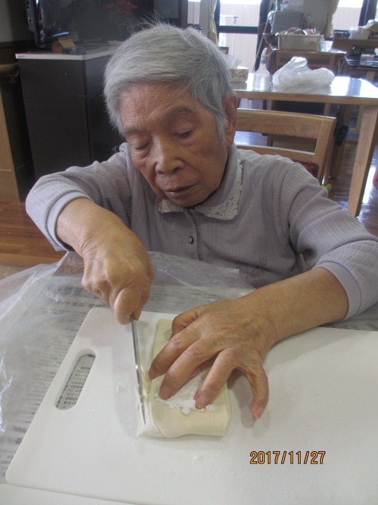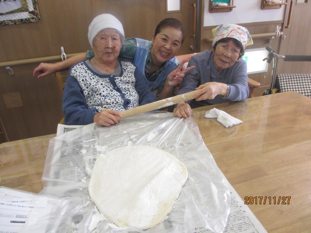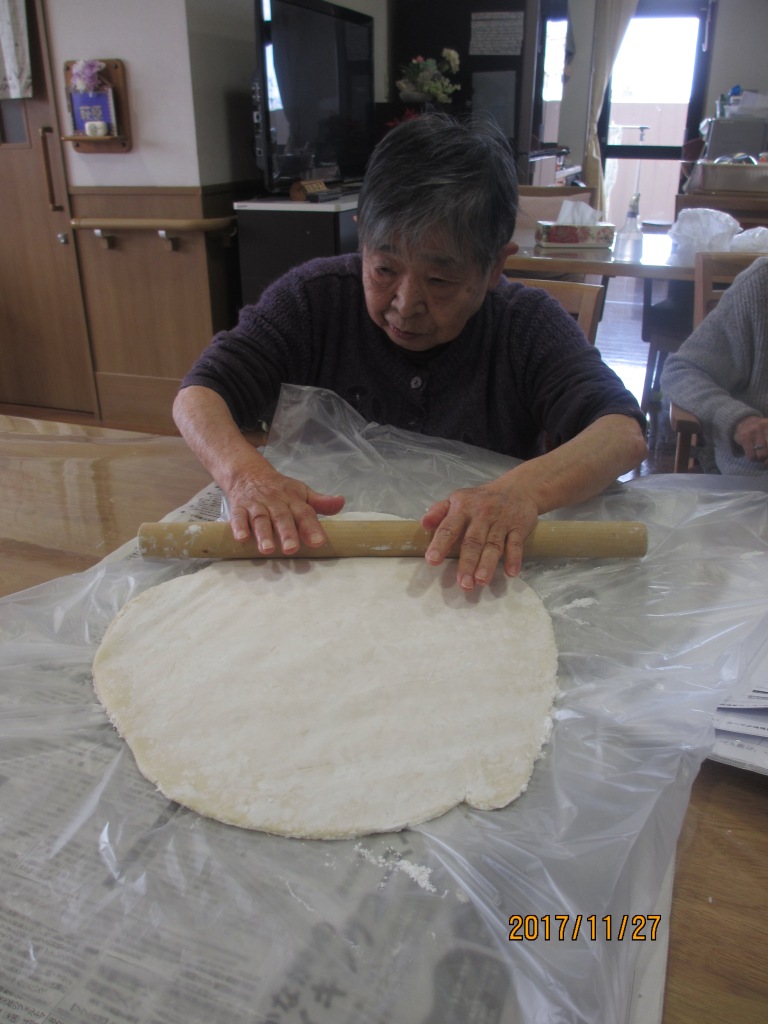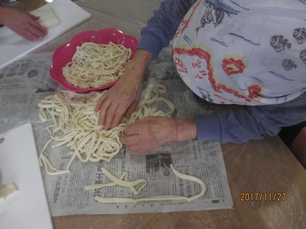 今日の昼食は『手打ちうどん』です☆気合いをいれて頭に三角巾を被りながら皆様、一生懸命に手でこねたり、足踏みしたりと♬その後、生地を切ってもらい美味しいうどんの出来上がり☆皆様、笑顔多く楽しい昼食の時間となりました!