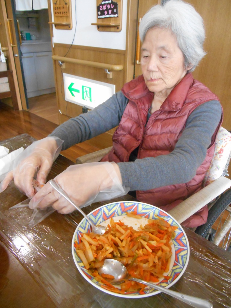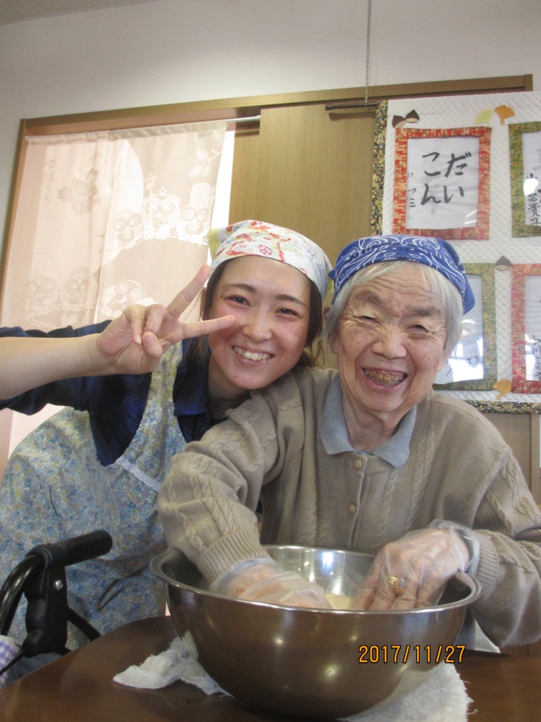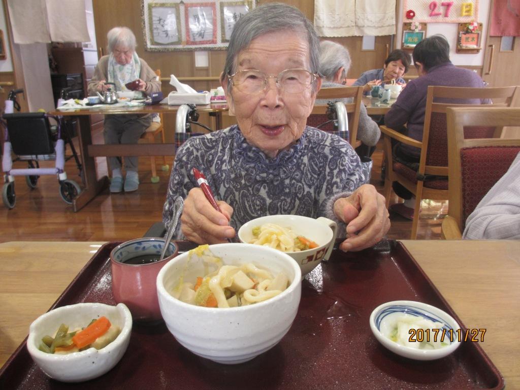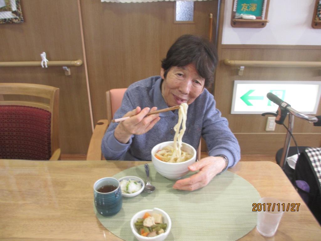 今日の昼食は『手打ちうどん』です☆気合いをいれて頭に三角巾を被りながら皆様、一生懸命に手でこねたり、足踏みしたりと♬その後、生地を切ってもらい美味しいうどんの出来上がり☆皆様、笑顔多く楽しい昼食の時間となりました!