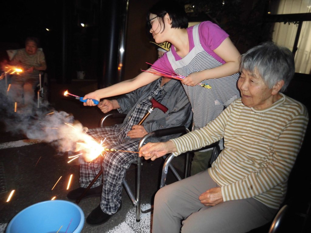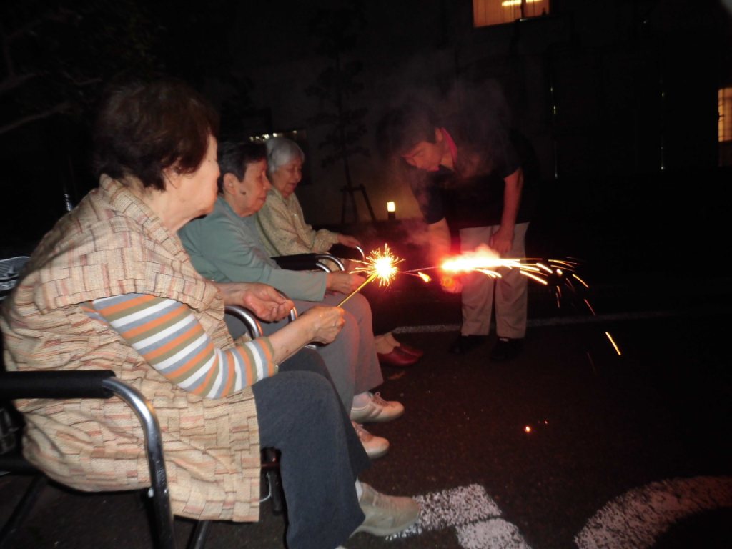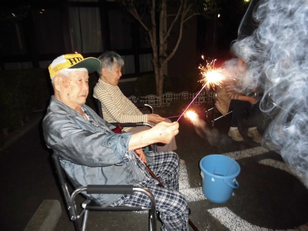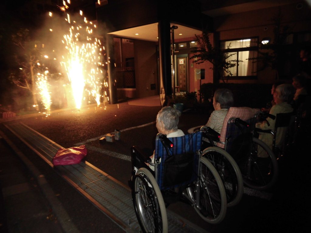 秋が近づく前に『プチ花火大会』を開催しました♪皆さま思い思いに手持ち花火を持って…点火!!!!勢いよく花火より火花が散り歓声が上がりました☆最後に、吹き出し花火に驚きつつ“きれいね♪”と楽しまれました☆