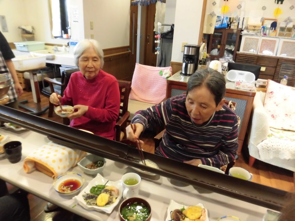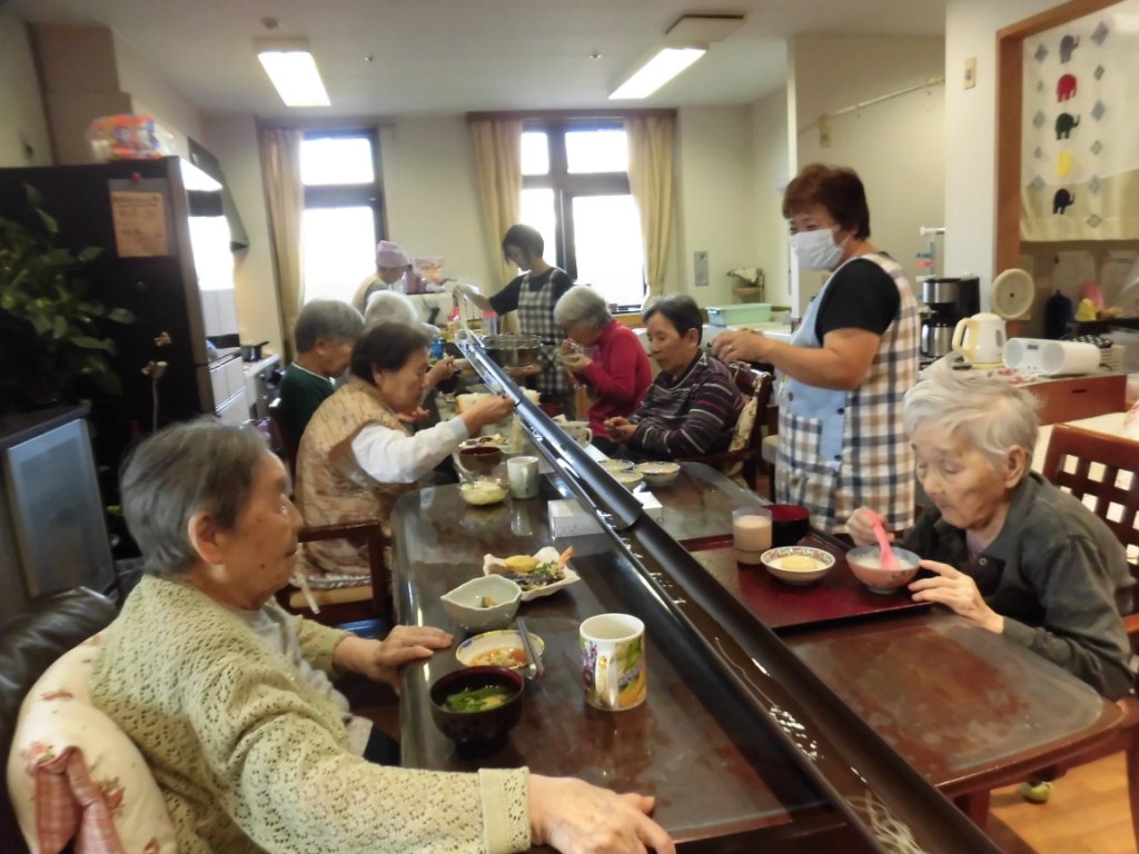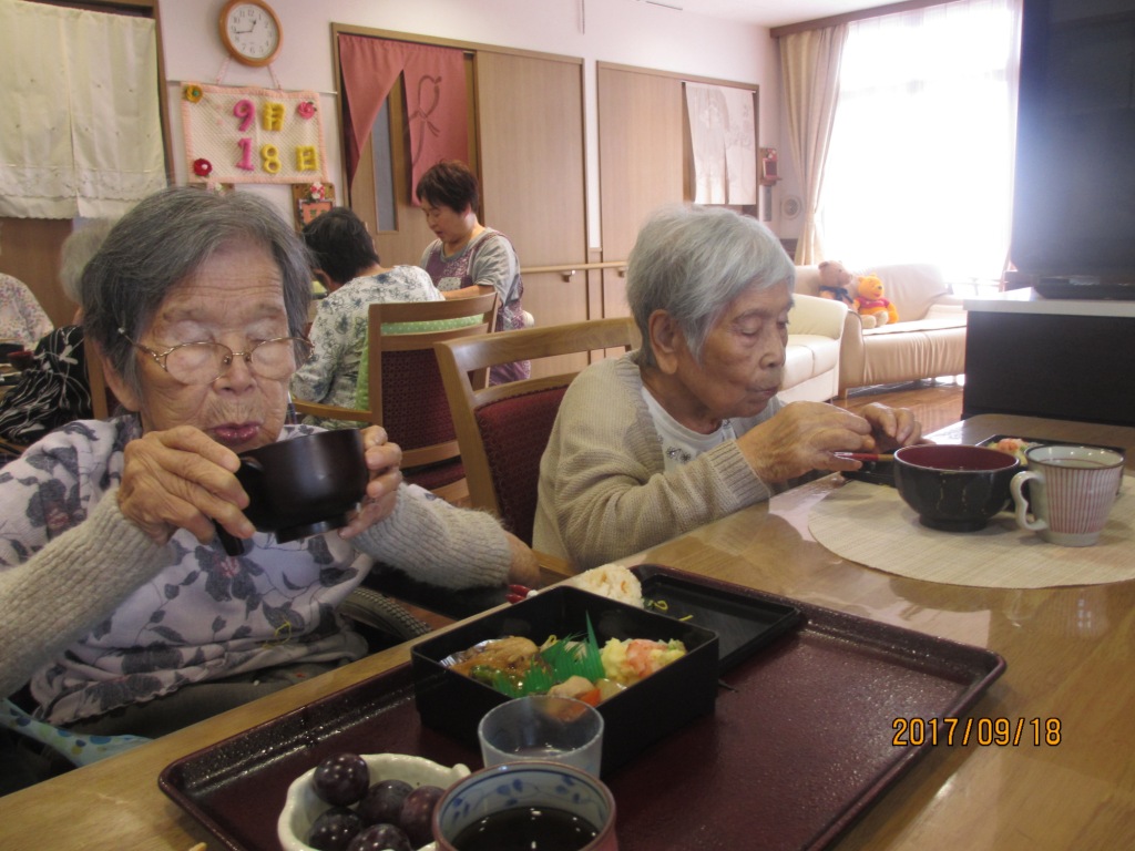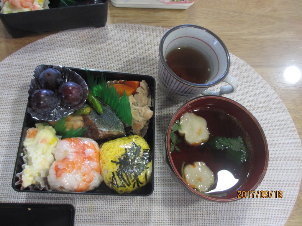 敬老の日という事で『手毬寿司』、『ブリの照り焼き』、『煮物』、『ポテトサラダ』、『フルーツ』をお重に詰めてお祝いしました☆見た目も綺麗で、味も美味しいと、皆様とても喜んでくれました♪