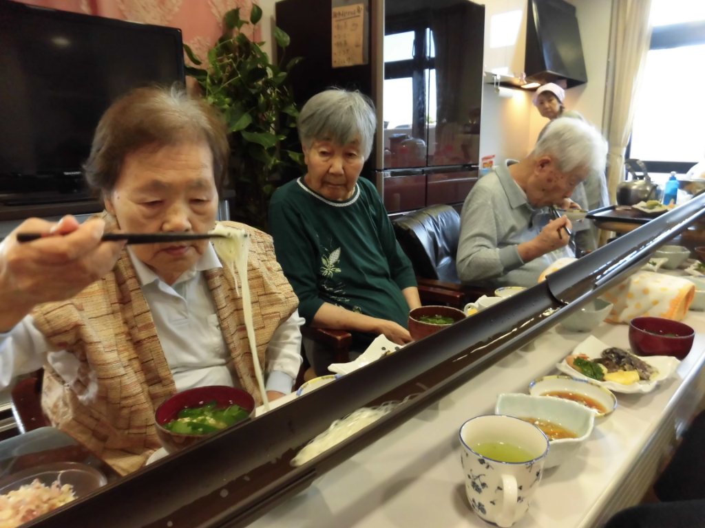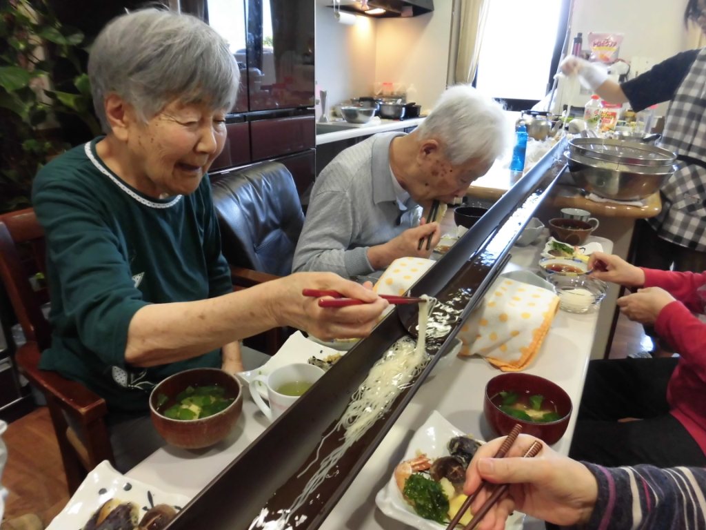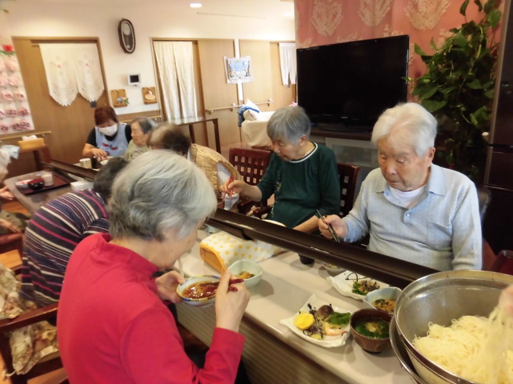 残暑のなか、『流しそうめん』に挑戦しました♪皆さま一列に並びお箸を構えて“早く流して!!”と、気合十分☆次から次へと流れてくる素麺を取っては頬張り…いつもより旺盛に召し上がられました♪