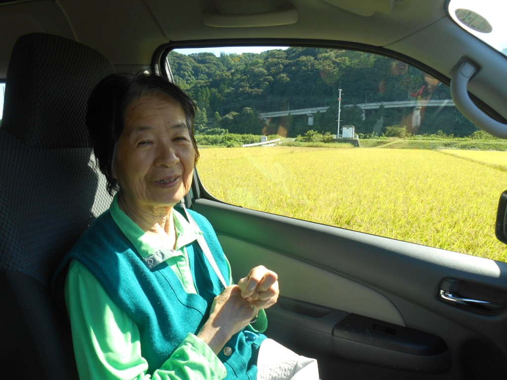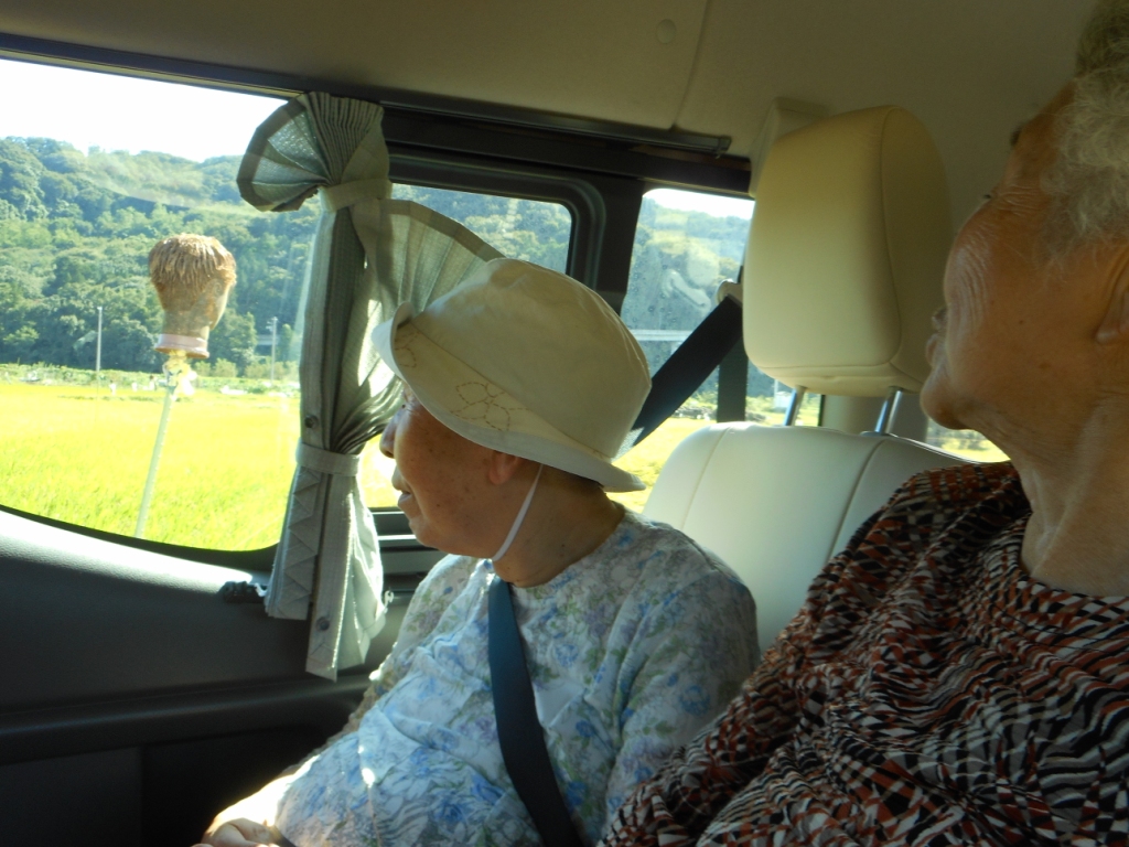 今日は、天気もよくドライブ日和♬『ゆりユニット』と『ひばりユニット』と一緒に愛川町まで稲穂を見にドライブを♪日の光を浴びて金色に輝く稲穂に皆様、大喜びでした☆でも…田んぼにあったカカシ(?)には皆様ビックリ!