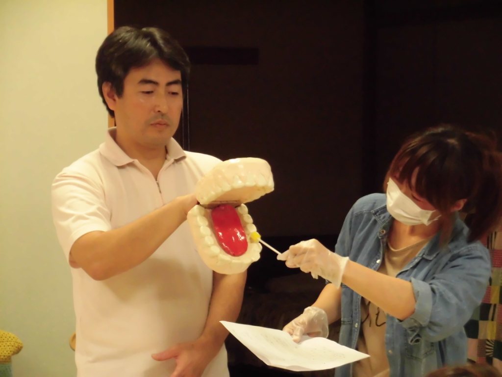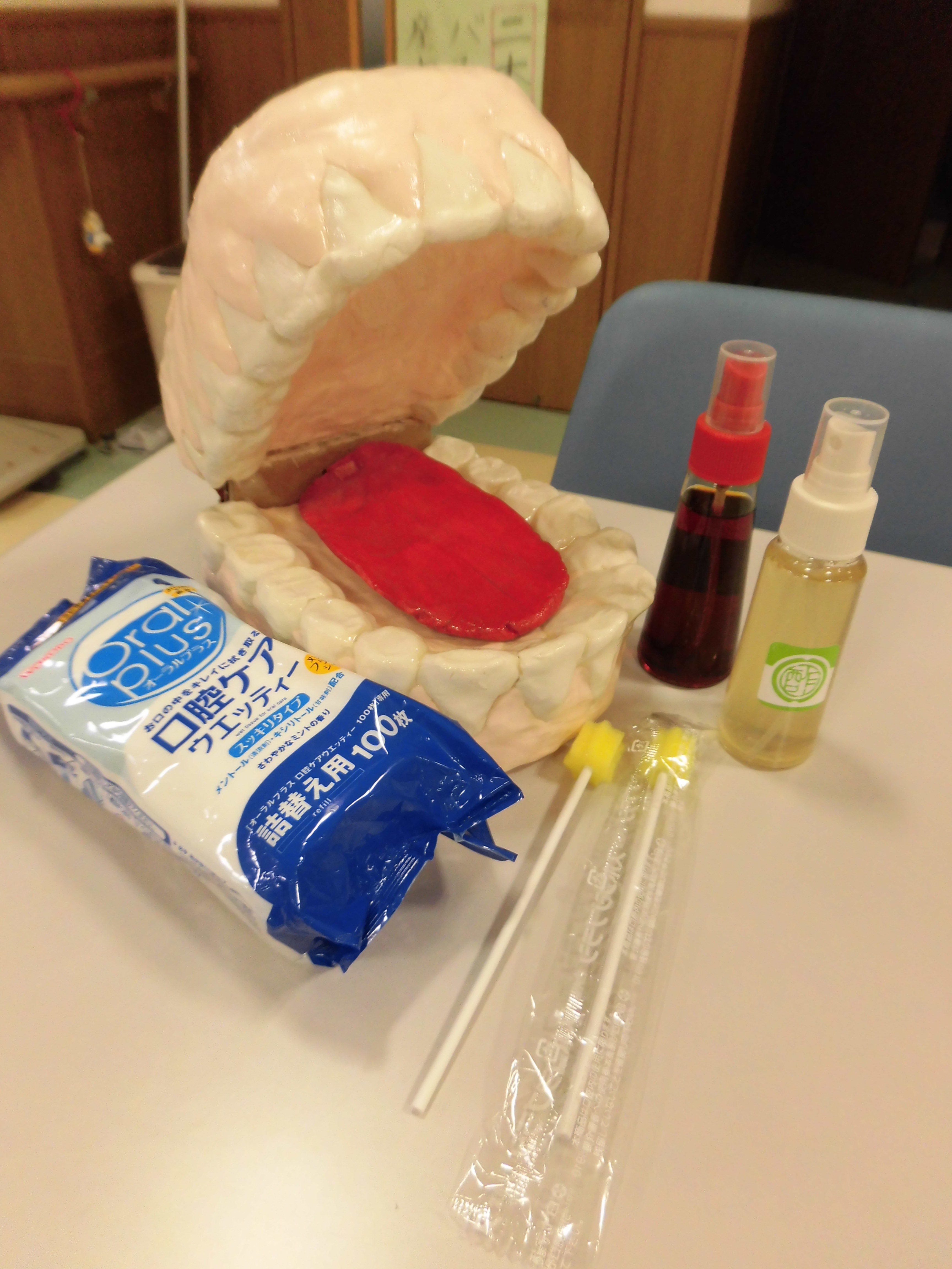 今月の職員の勉強会は『看取りの際の口腔ケアについて』を行いました。口腔ケアはなぜ行うものか、口腔ケアの注意点などについての勉強会を実施しました。また、口の模型を使用し実演を行ったり、保湿の為の『イソジンスプレー』や『はちみつスプレー』の違いを体験してもらいました。