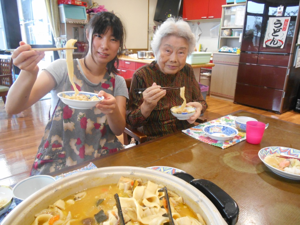今度は『手打ちほうとう』作りをしました♪もう慣れた手つきでこねたり、薄くしたりと☆お腹いっぱいで、余ったほうとうは『ほうとうのピザ』にして2度おいしく頂きました♪
