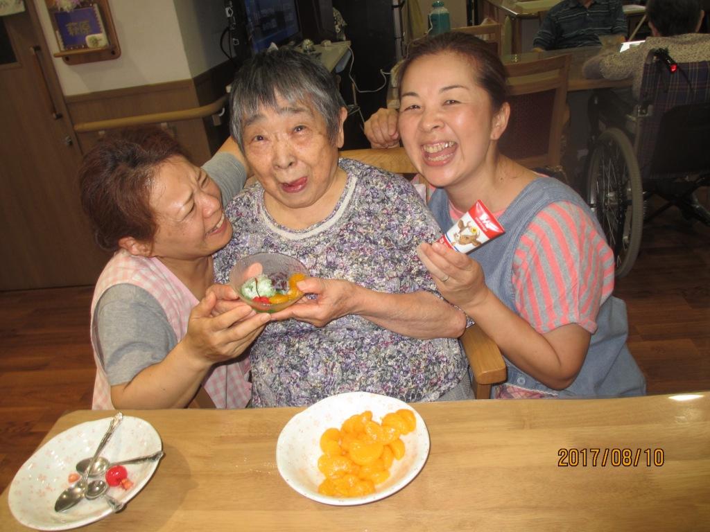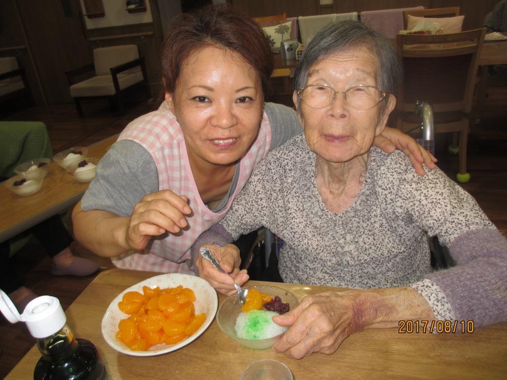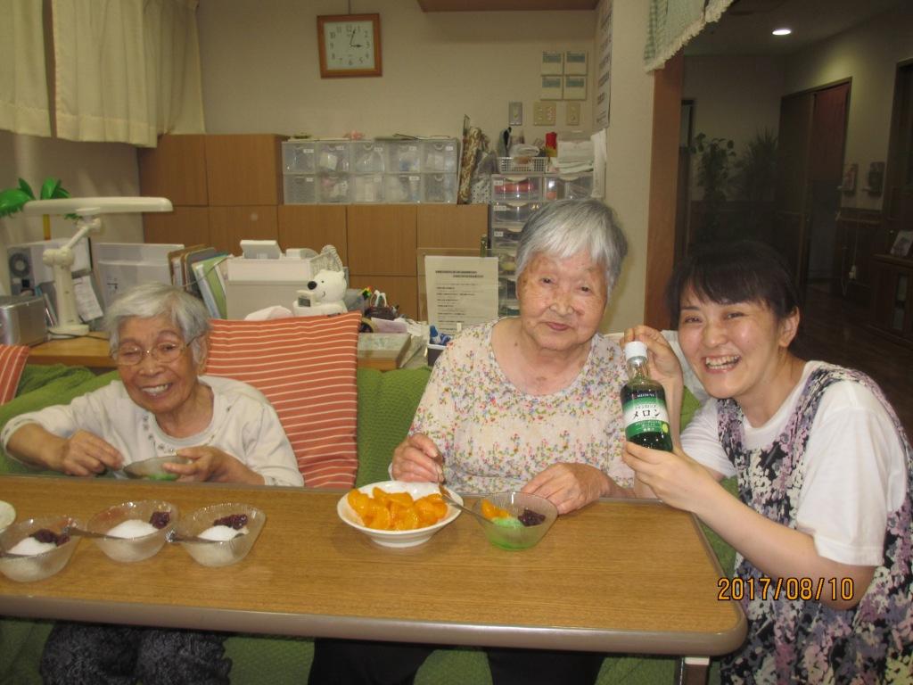 むしむし暑いので、今日は『かき氷』です♪皆様、お好みのトッピングを選んでオリジナルのかき氷を食べました!“冷たくて美味しいね”と笑顔多く楽しいおやつになりました♬