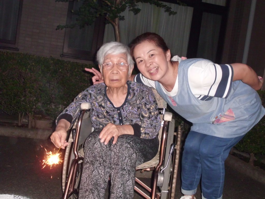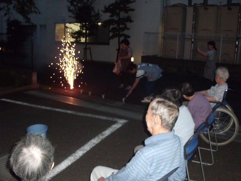 夕方涼しくなってから手持ち花火を行ないました♪一人一人が手に持ちながら、“綺麗だね♪”、“子供の頃よくやったなぁ!本当に昔を思い出すわ”などと昔の事を思い出しながら懐かし楽しまれていました☆最後はドラゴン花火で歓声があがり、楽しいひとときを過ごしました♪
