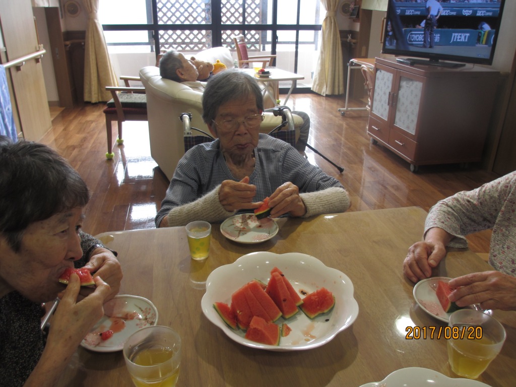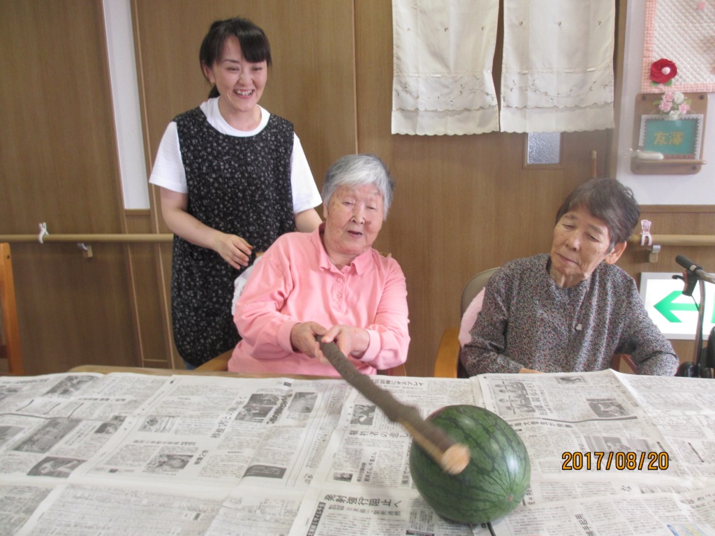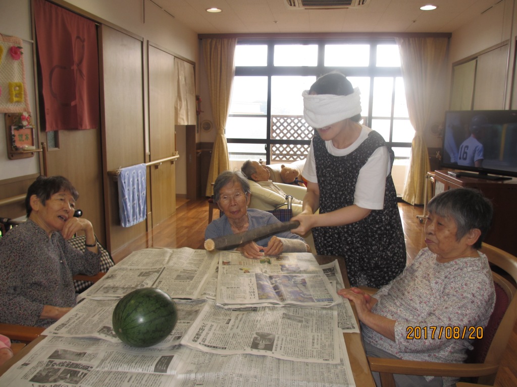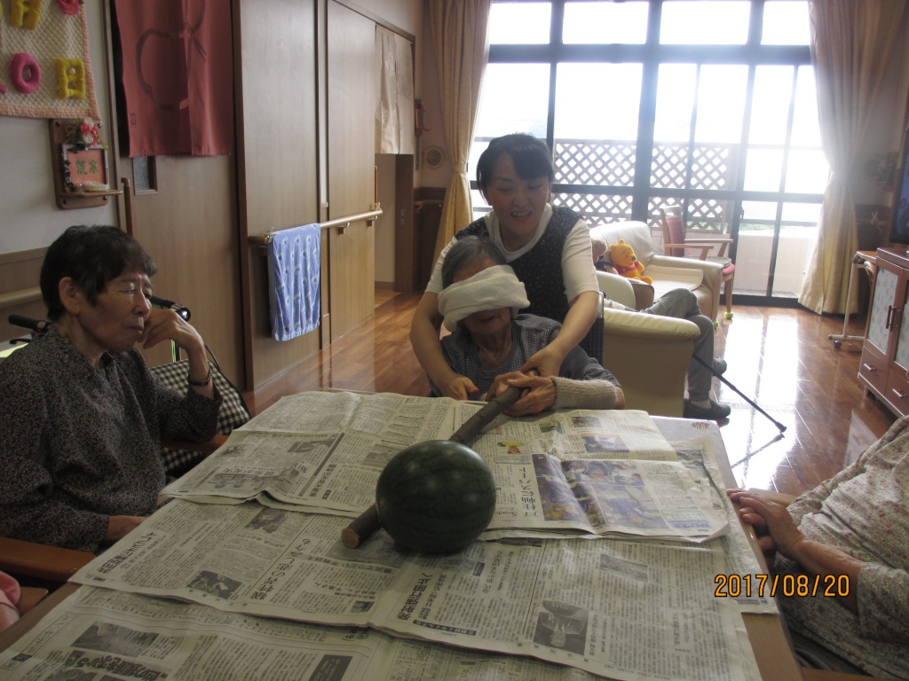 椅子に座りながらテーブルの上でスイカ割りをしました☆最初は目隠しをしてたのですが、あたらず・・・割れず・・・目隠しを取ってやってもあたらず(笑)!大笑いしながら楽しみました♪あたって割れたスイカは皆様で美味しく頂きました!