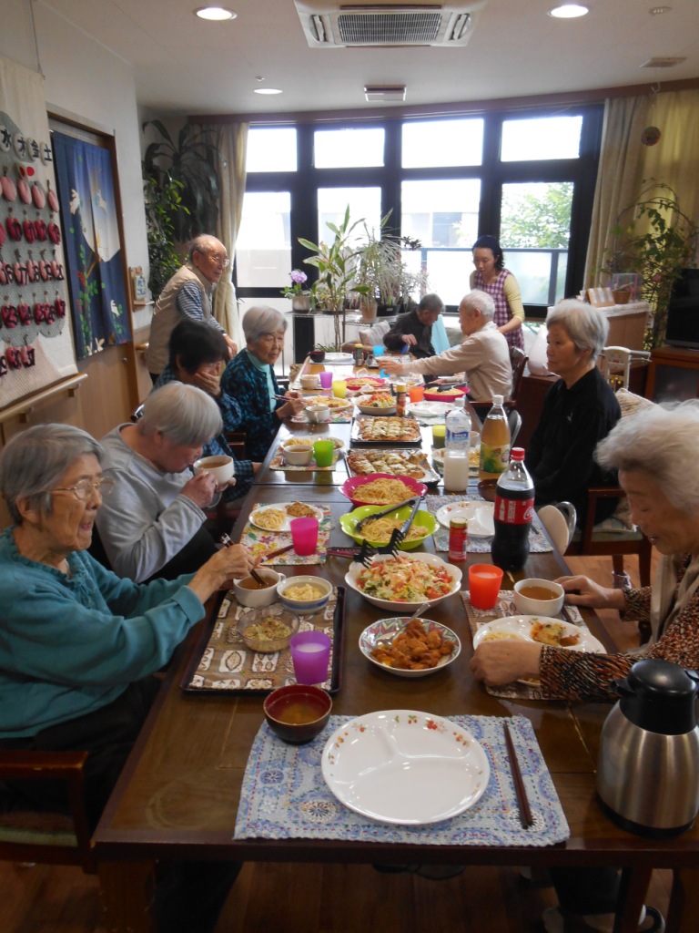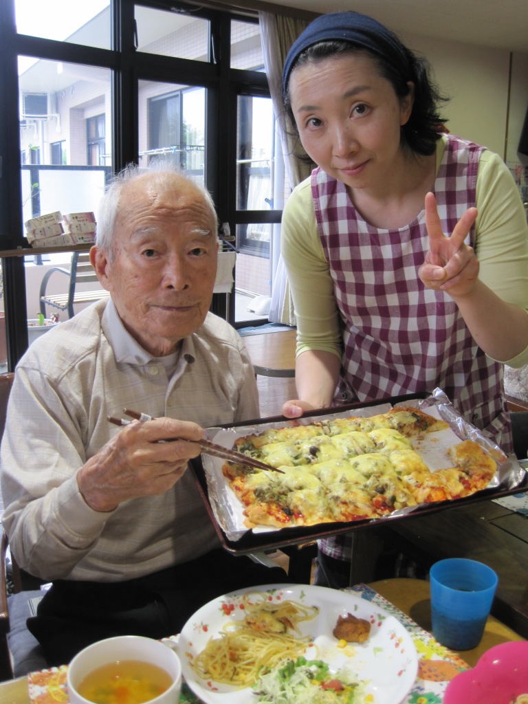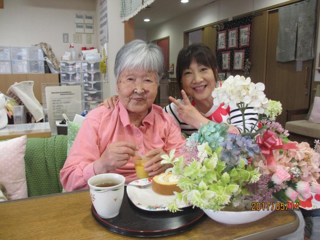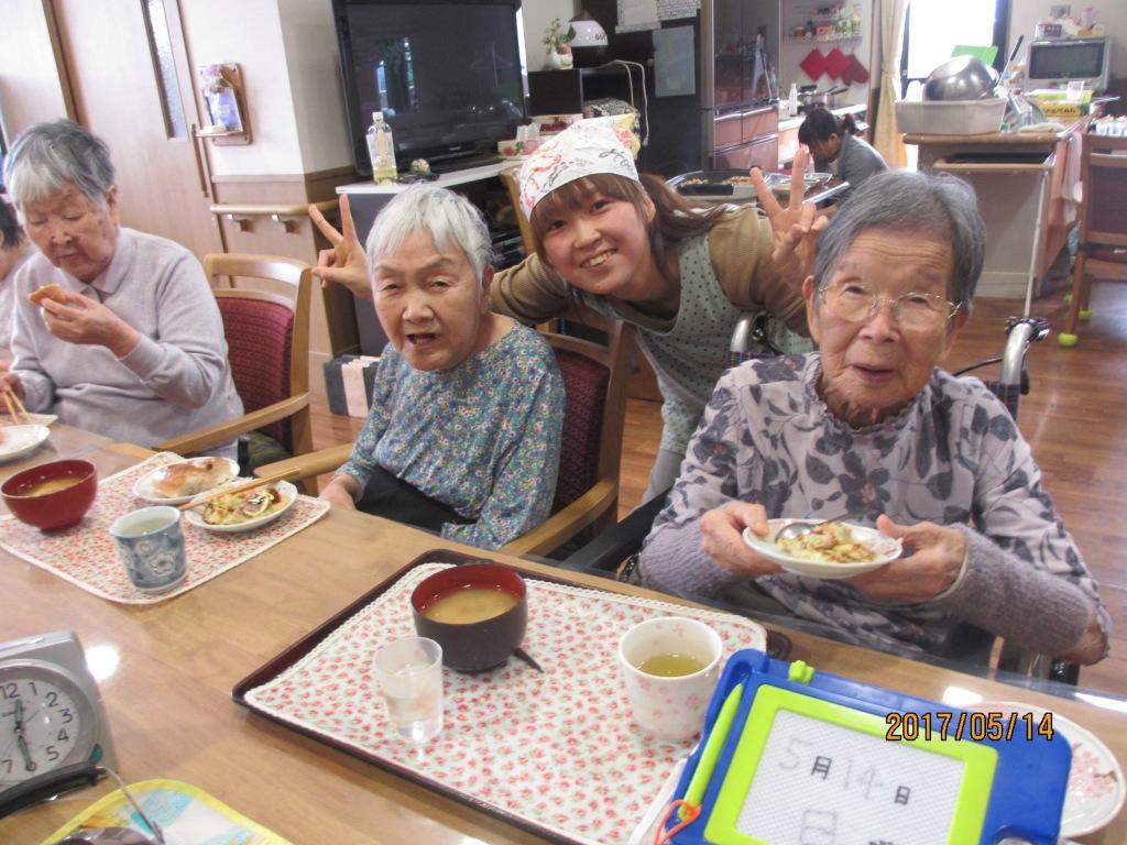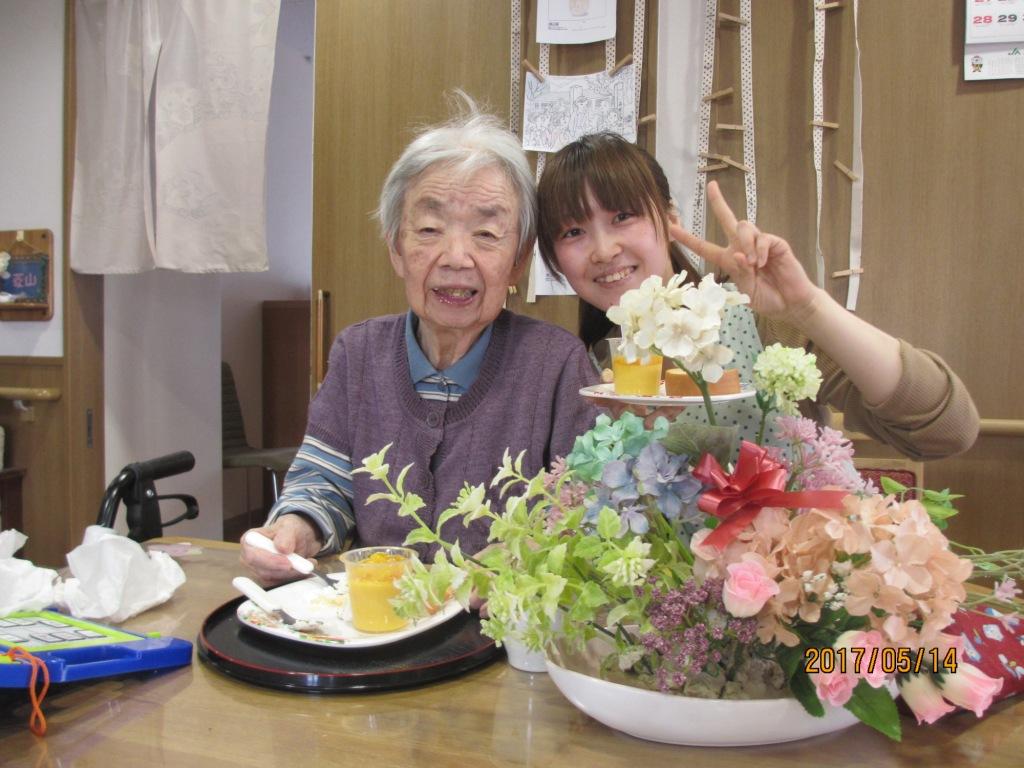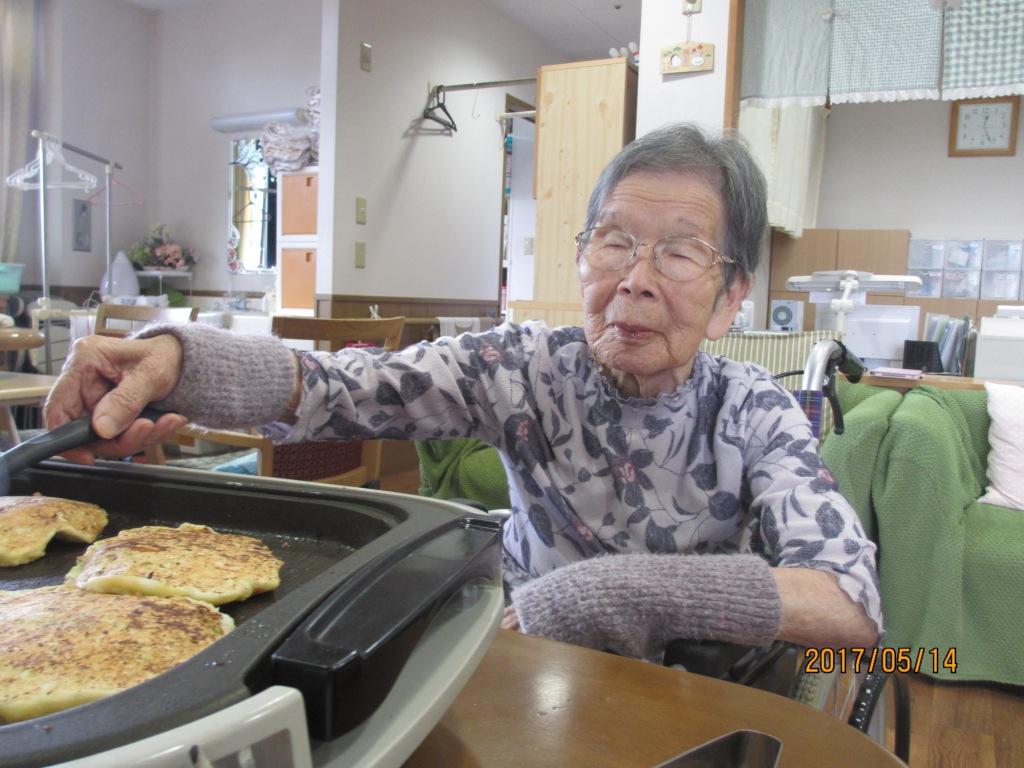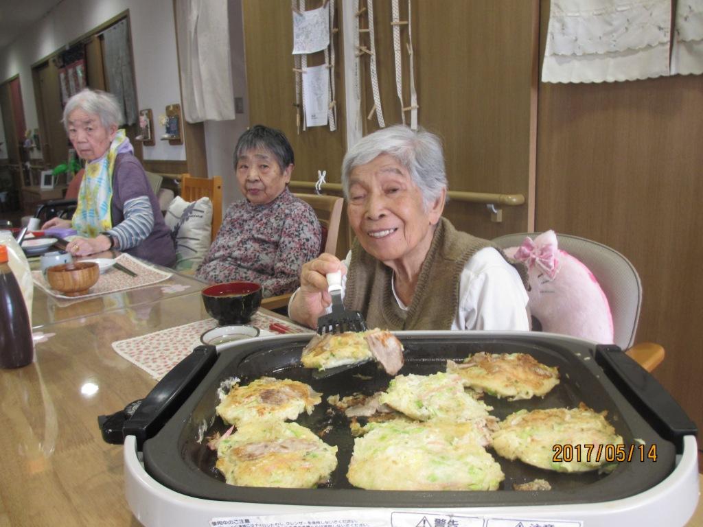 今日のお昼ご飯は『お好み焼き』。母の日なのに、皆様に具材を切って頂いたり、かき混ぜてもらったり・・・焼けたお好み焼きをひっくり返すのも、お願いしました(笑)“今までで一番おいしいお好み焼きだわ♪”と皆様大喜び♬そしておやつには、マンゴープリンとロールケーキでお祝いしました☆