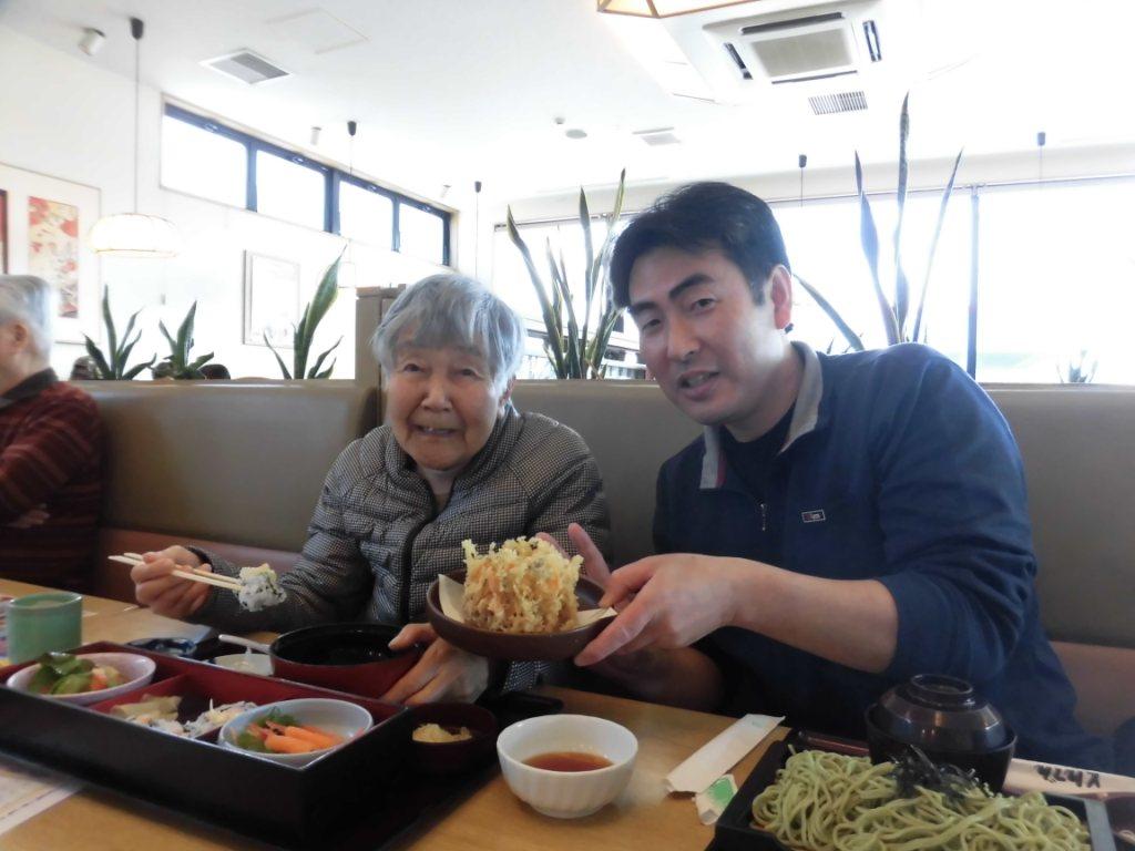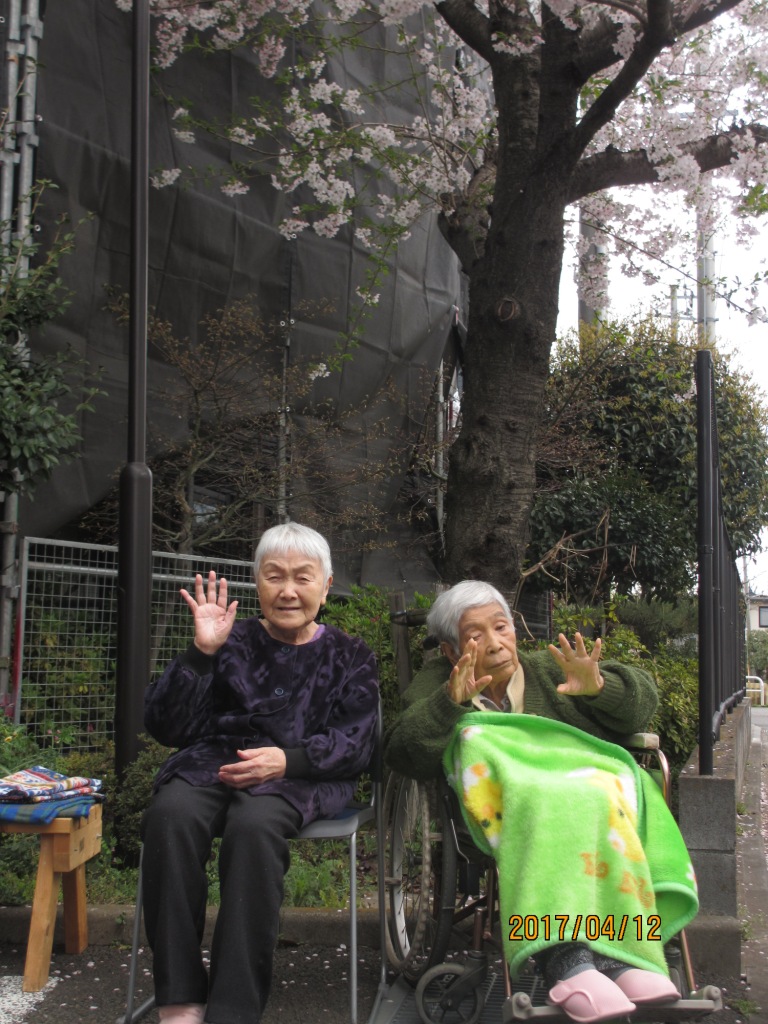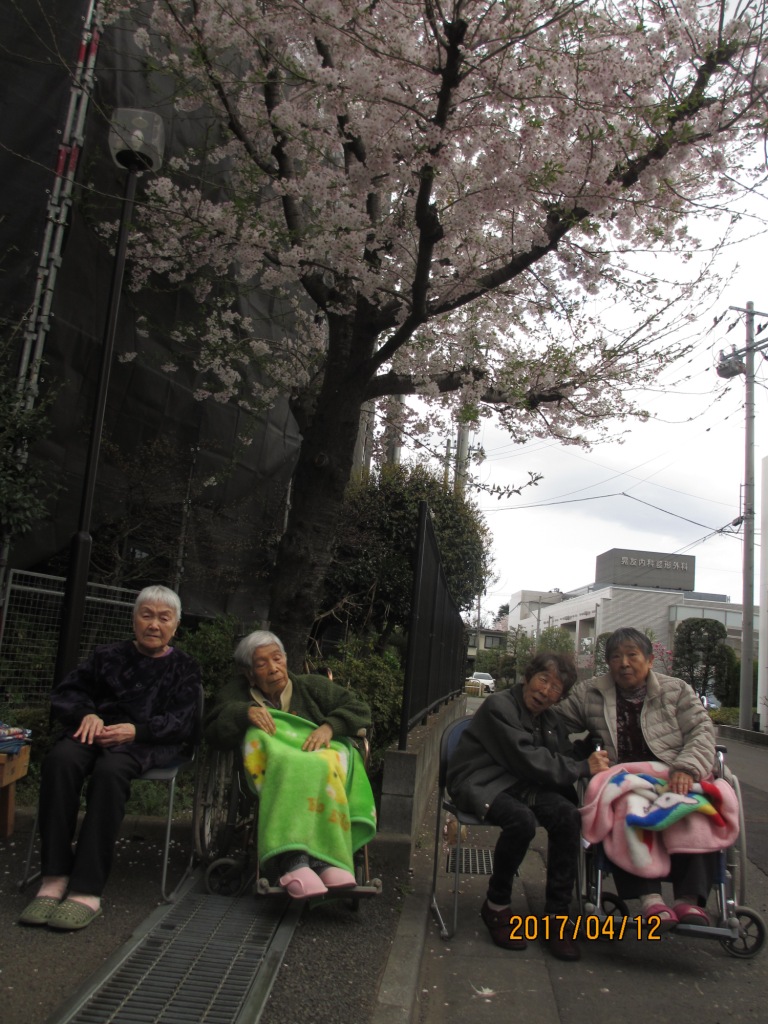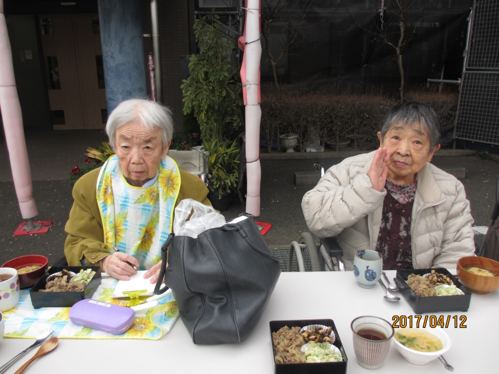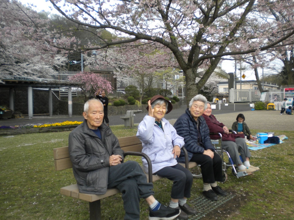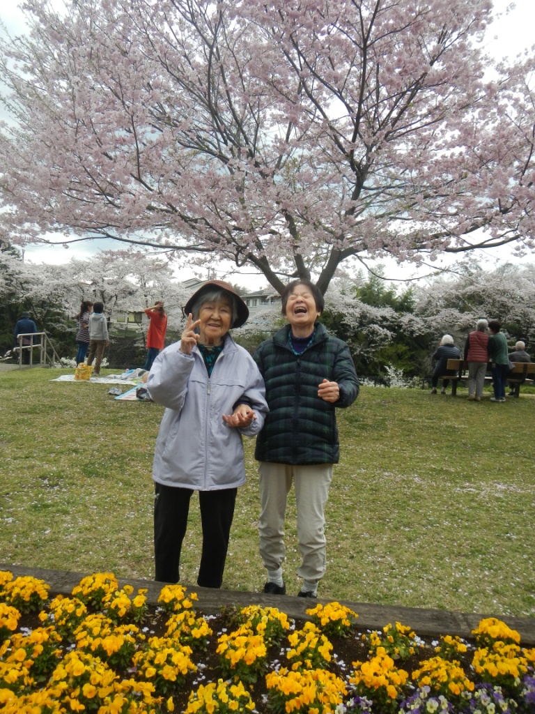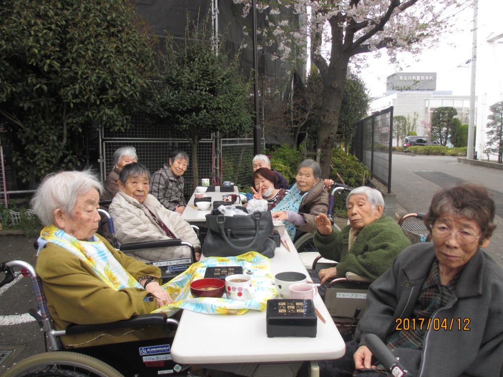 今日の昼食は、グループホームの前で、ご飯やおかず、フルーツをお重に詰めて、皆様で桜の木の下でお花見をしながら食べました♪お酒はないけど、皆様で歌を唄ったり、話しも盛り上がったりと楽しいひとときを過ごしました☆