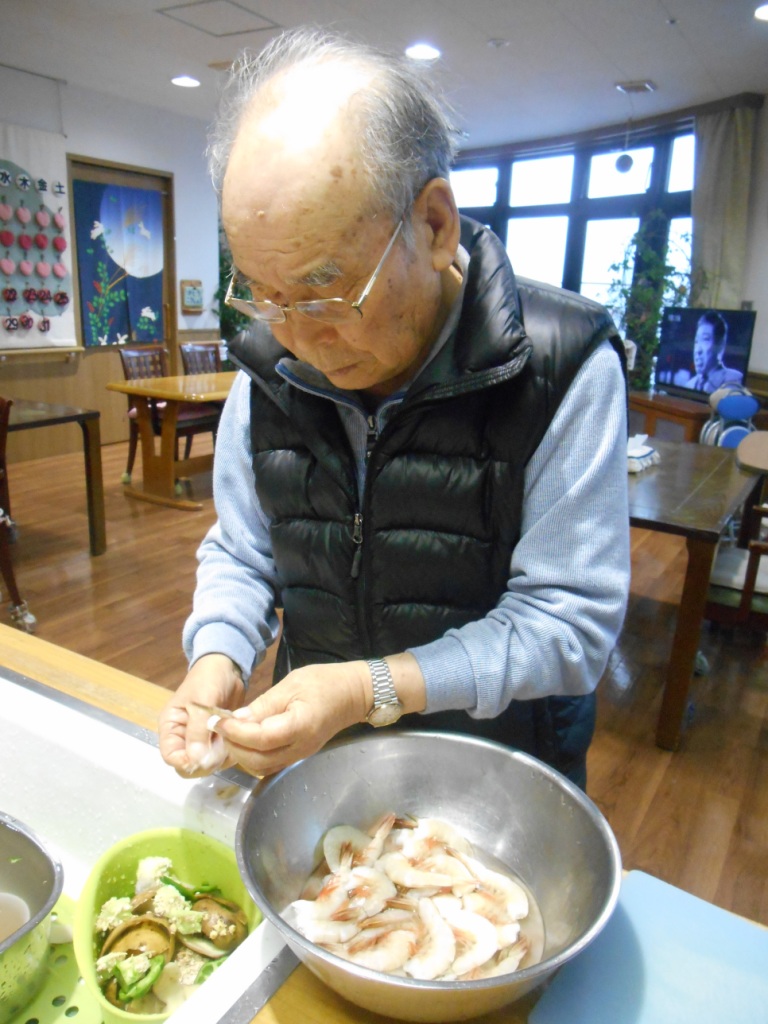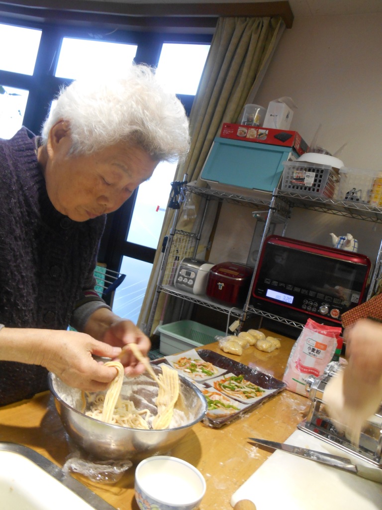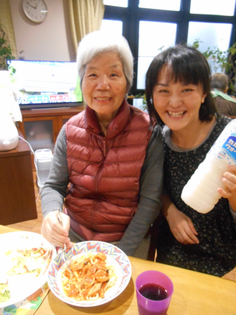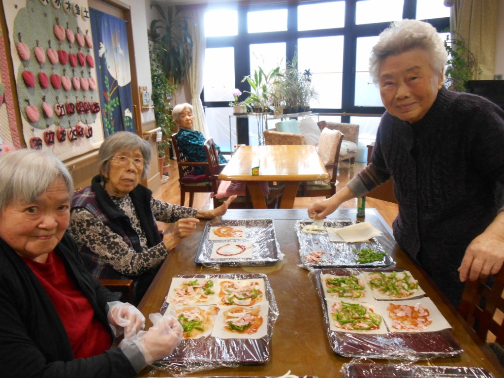 今日の昼食はパスタの製麺機を使っての『初の生パスタ』と『ミニピザ作り』をしました☆皆様、“うどん作りとほとんど同じね♬”と楽しそうに春巻きの皮にピザの具をのせたり、生パスタ一緒に作ってくれました♪たくさんの料理を食べたり飲んだりで皆様、笑顔いっぱいでした☆