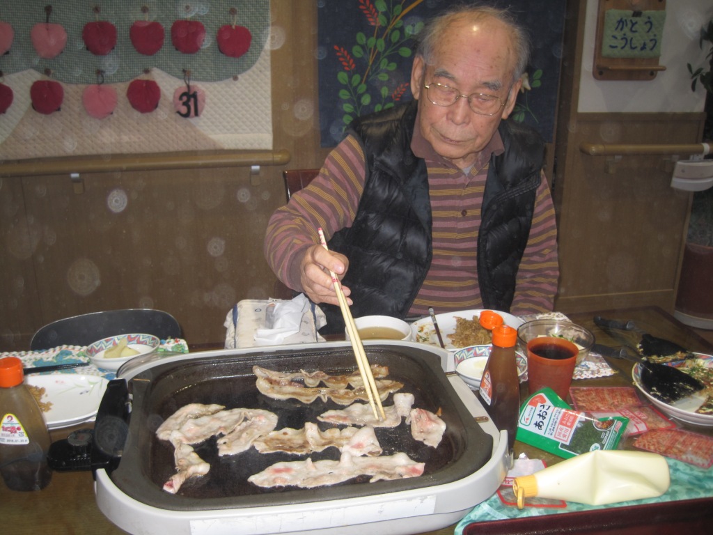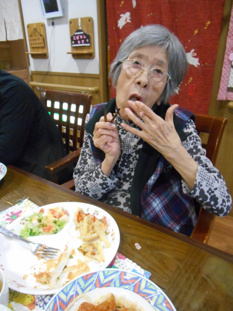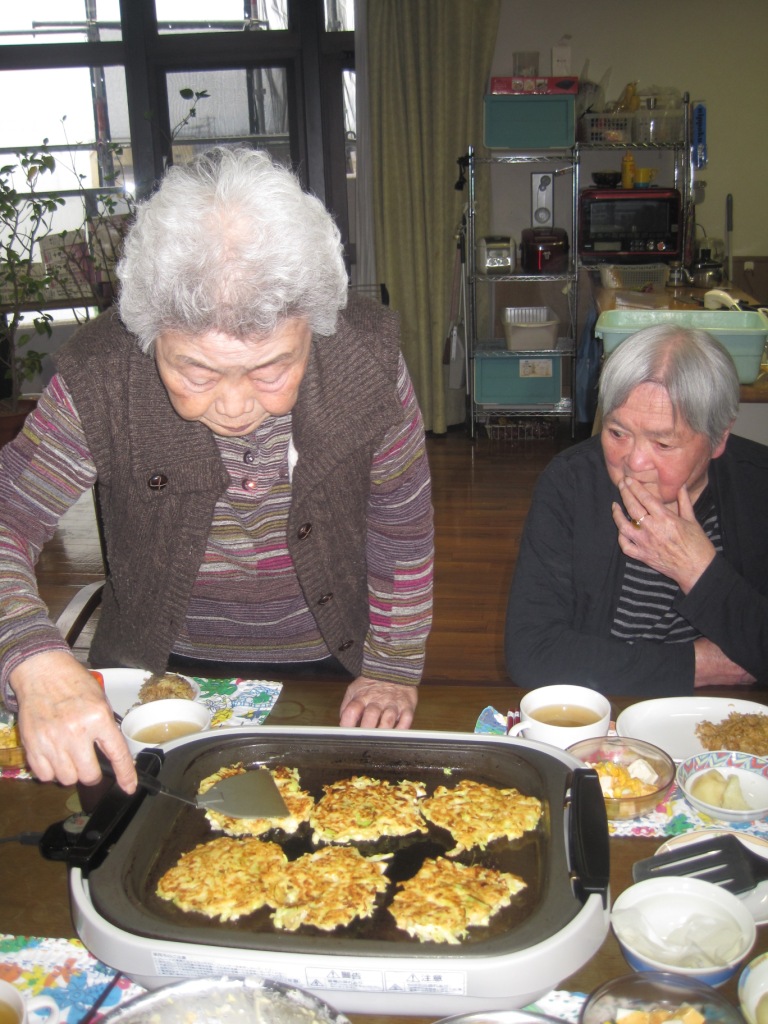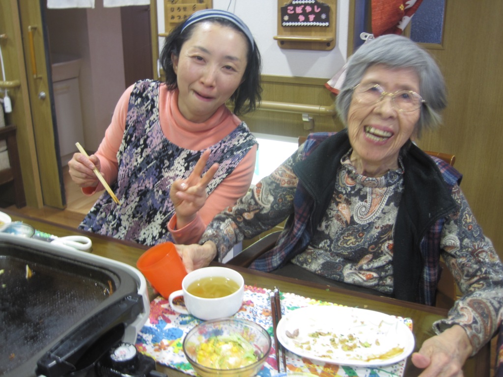 今日の昼食は、『お好み焼き』と『そば飯』です。皆様にホットプレートで焼いて頂き、“ほッ!”と言いながら上手にひっくり返し出来立ての美味しいお好み焼きを食べることが出来ました♪次回は、そば(焼きそば???)も手打ちで作って広島風お好み焼きに挑戦してみようかと思います!!!