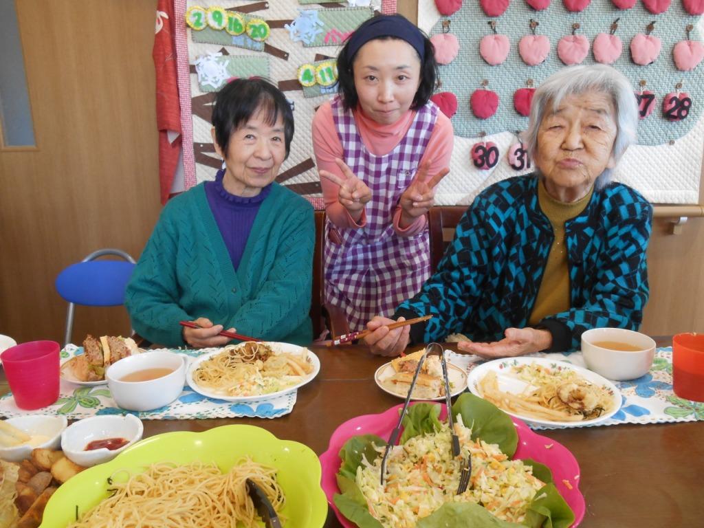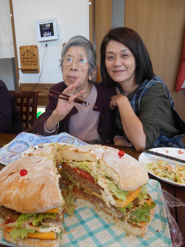 今日の昼食は『巨大ハンバーガー』を生地から皆様と一緒に作りました♪皆様、大きな口を開けて召し上がりました!他にもオニオンタワーやフライドポテトとたくさんの料理に“こんなに食べられるかしら?”とびっくりの様子でした。