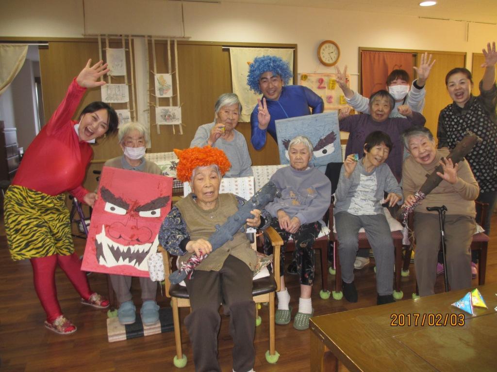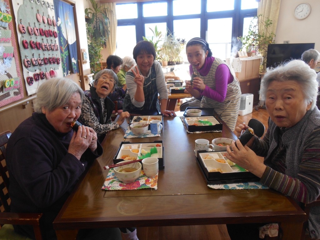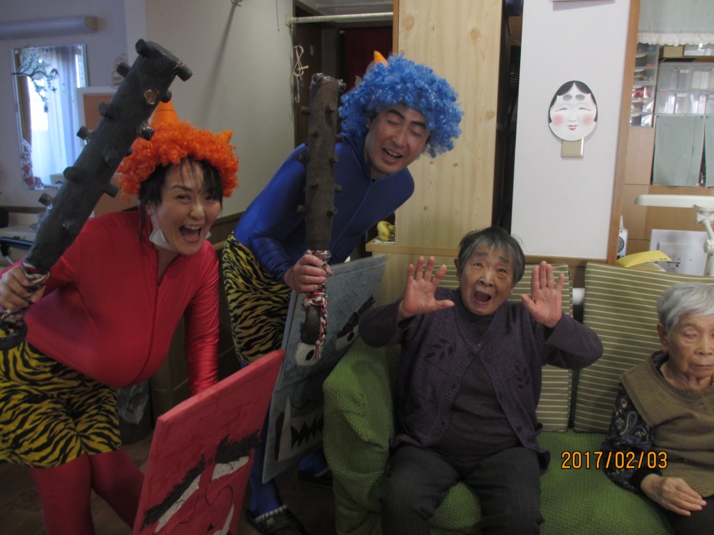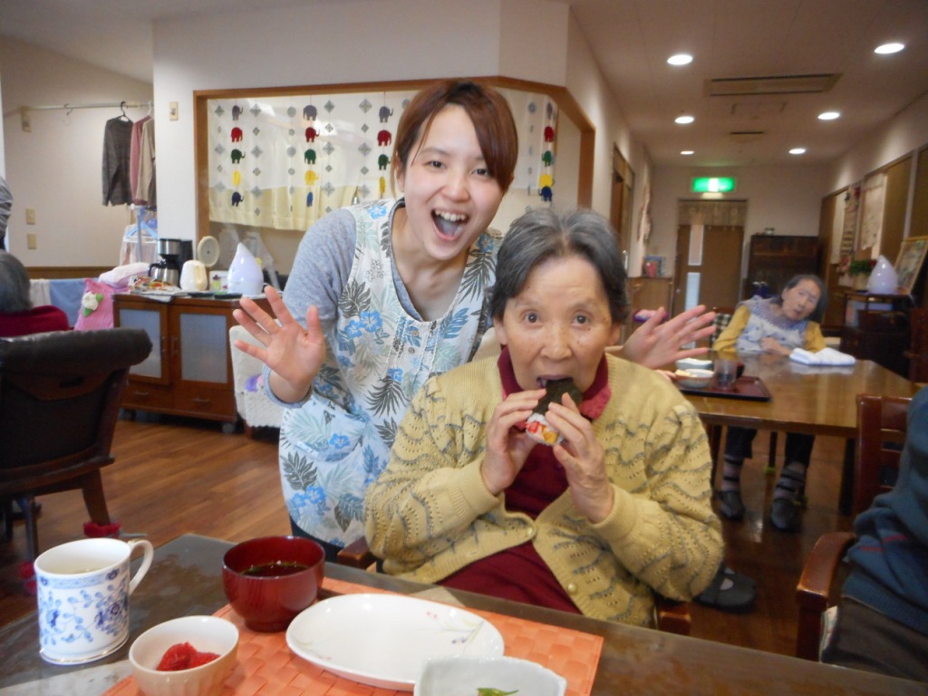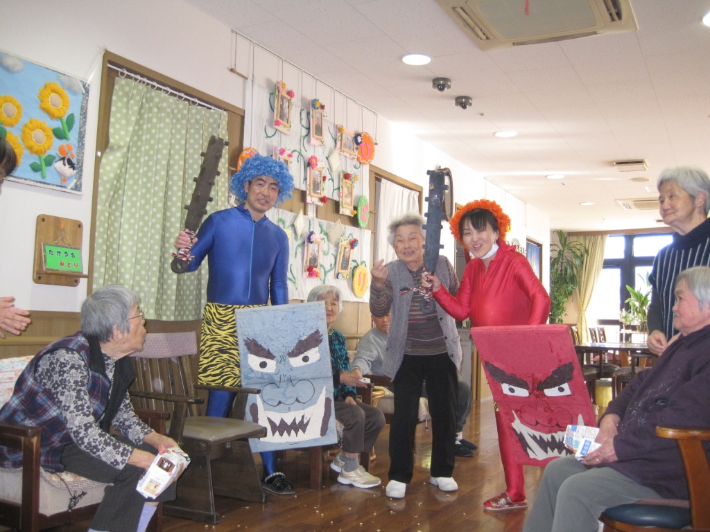 各ユニットの節分の日のお昼のメニューは『恵方巻き』でした☆皆様お腹いっぱいに召し上がった後はユニットに来た赤鬼と青鬼に“鬼は~外ッ!福は~内ッ!”と笑顔いっぱいで豆まきをされていました♪