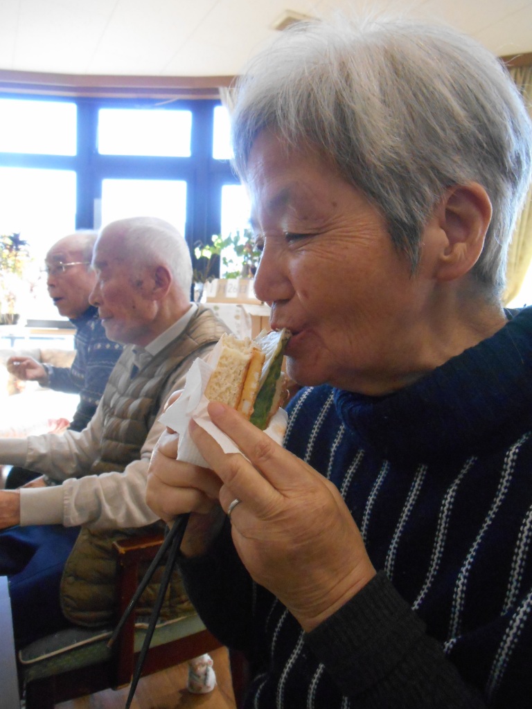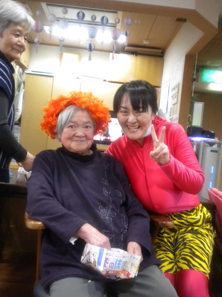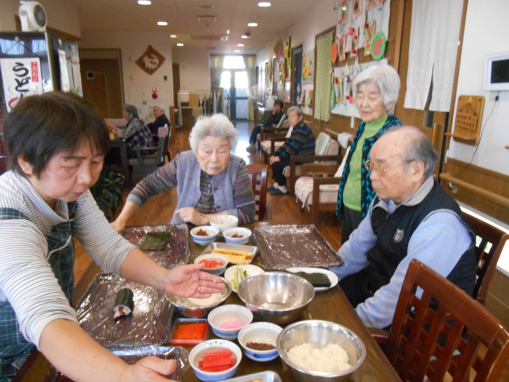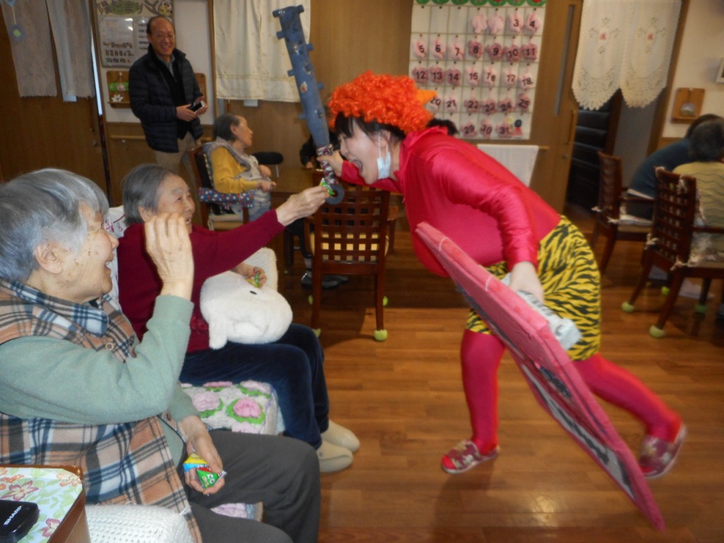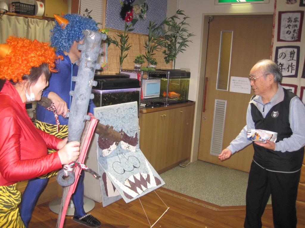 各ユニットの節分の日のお昼のメニューは『恵方巻き』でした☆皆様お腹いっぱいに召し上がった後はユニットに来た赤鬼と青鬼に“鬼は~外ッ!福は~内ッ!”と笑顔いっぱいで豆まきをされていました♪
