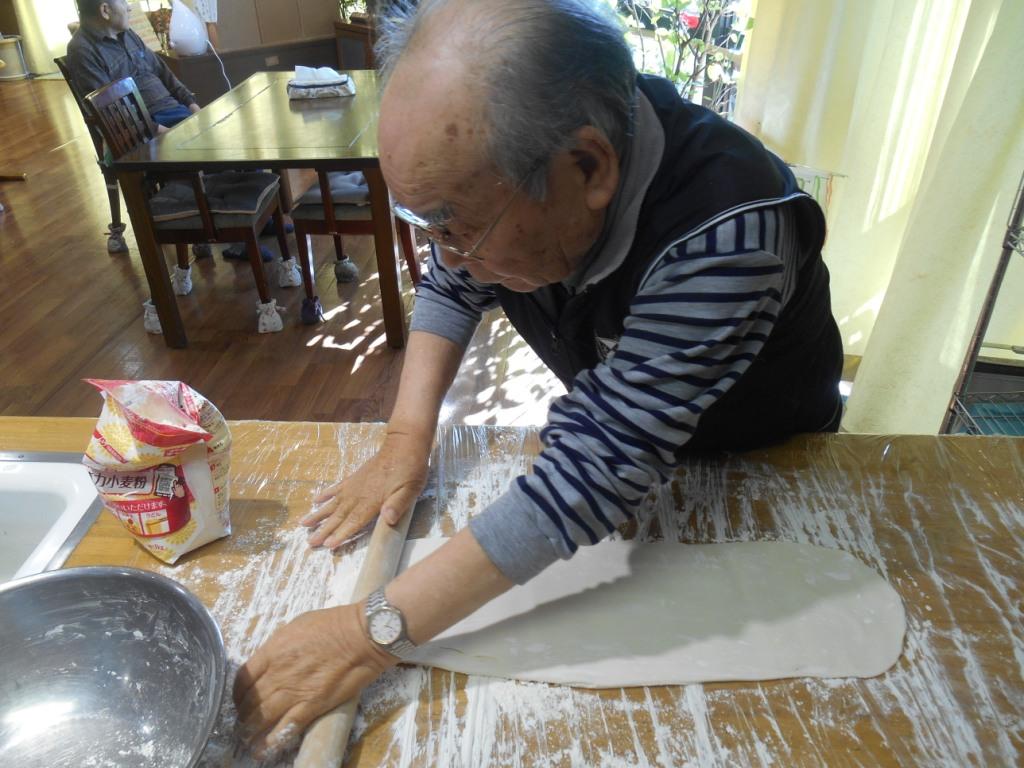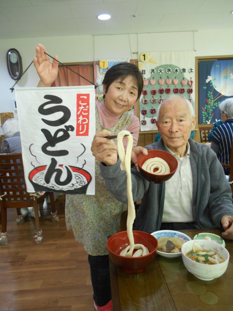太く長く生きようという気持ちを込めて『1本うどん』と作りました!“こんな太いうどんは食べたことない!”と言いながら皆様で美味しく頂きました♬