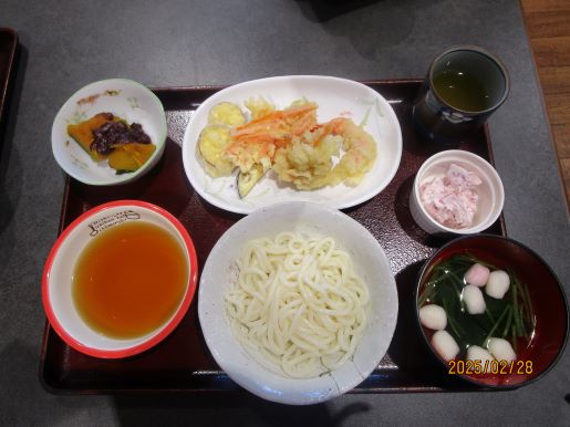 天ぷら、うどん、かぼちゃの煮物、いちごのアイスにしました☆天ぷらはエビ、ナスは定番の物とかき揚げにさつま芋とコーンとねぎのかき揚げにしてみました。天ぷらに少し苦戦しながらも皆さんに協力で何とか食事が完成しました♪