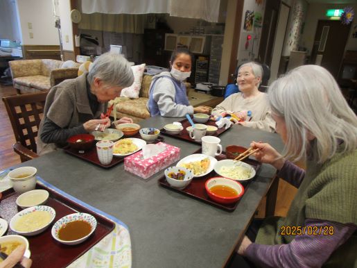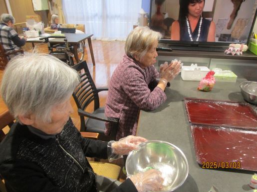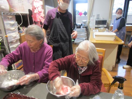 ひな祭りの今日はあったかい蒸しパンを作って食べよう!ということで大豆をフードプロセッサーにかけてきな粉つくりからはじめて、ひし餅カラーにしたいねと生地に色をつけて蒸してみました。エレベーターホールには平飾りのお雛様が展示されていて皆で観覧しながら歌を唄いました~♪外は雪で想い出深い桃の節句になりました☆