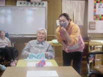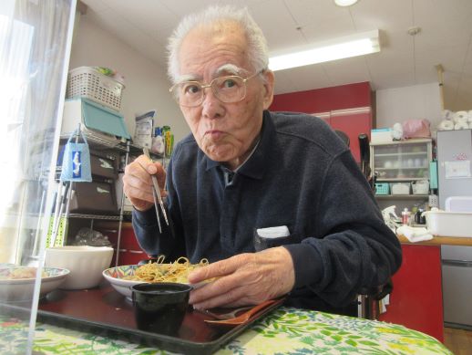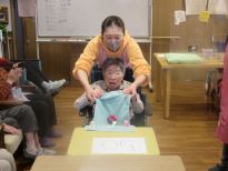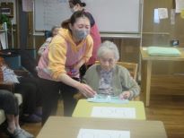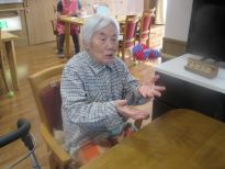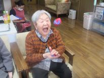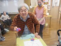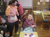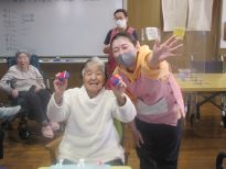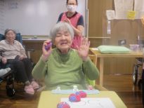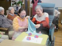 お手玉投げゲームを開催‼タオルを思いっ切り上に振り上げるとお手玉が飛んでいくゲームですが遠くにお手玉を飛ばすのは思ったより難しく皆さん手前に落下してしまいました…。それでも「そーれ」の掛け声で奮闘した皆さん☆昔良く遊んでいたというお手玉何回出来るかな?にチェンジし「もう一回やらせて」と熱が入ったご様子でした♪