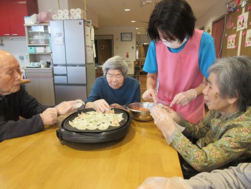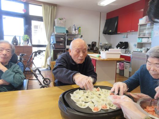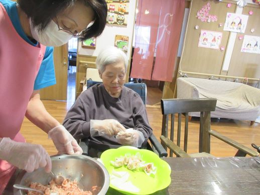 シュウマイの具をコロコロと丸めて皮で包んでいただきました!皆さんとても上手で作業はあっという間!たこ焼き用の丸い穴の開いたホットプレートで蒸し焼きにしました☆中華スープと一緒に美味しくいただきました♪