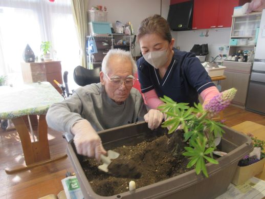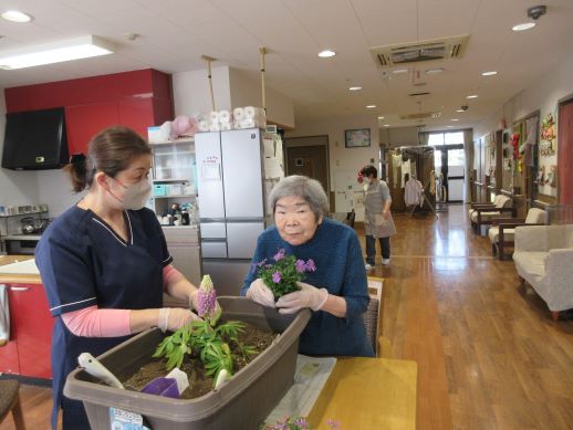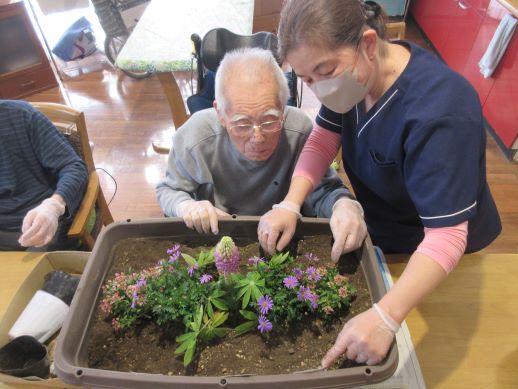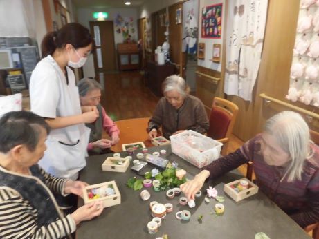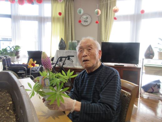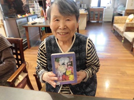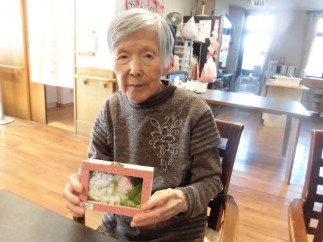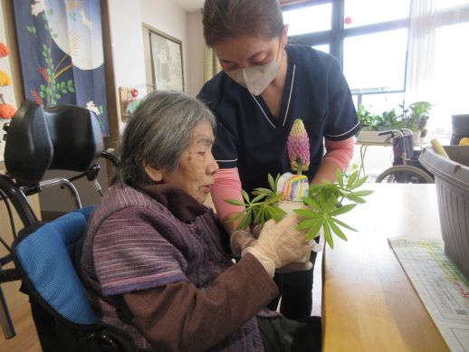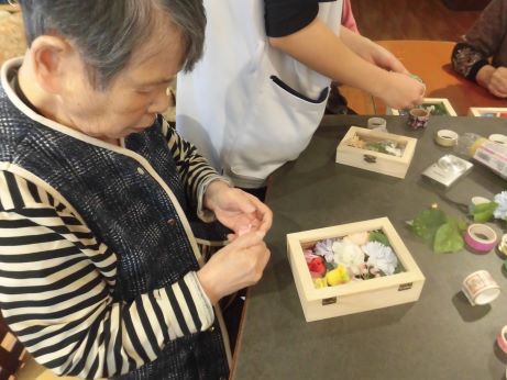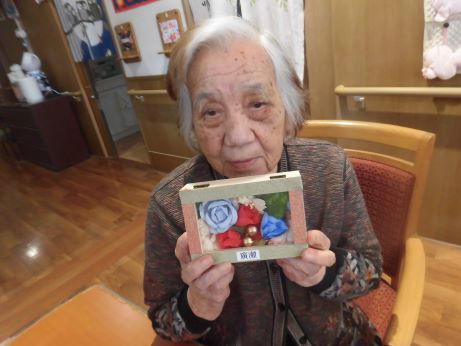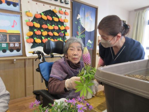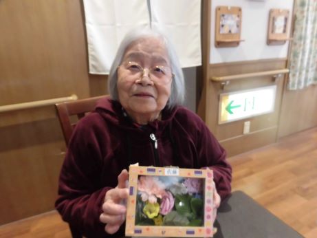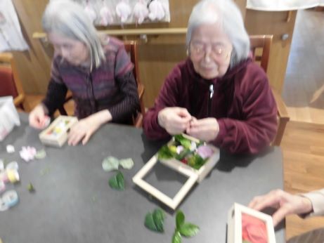 一人一人自分で花を選びながら配置や色を悩んでいると他者と相談しながら、これがいいかな、可愛いかなと会話を交わしながら完成させていました。完成した作品は各部屋に飾っています!是非とも面会に来た時に作品をみていただけたら嬉しいです♪
