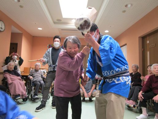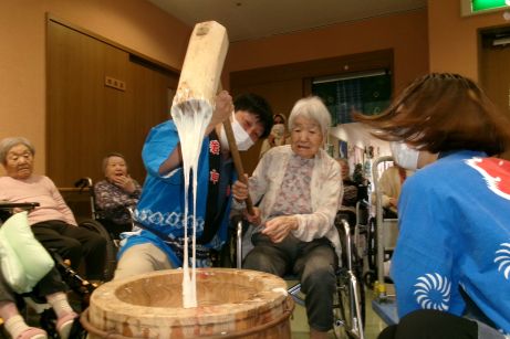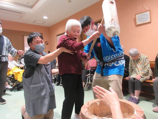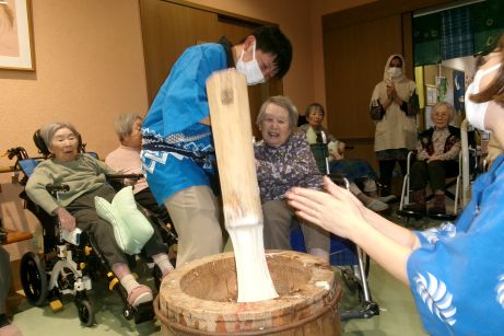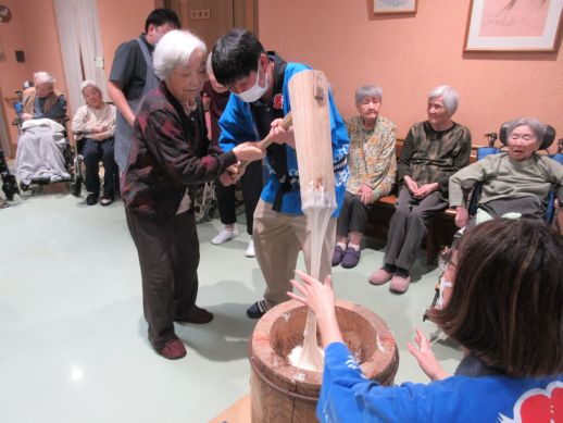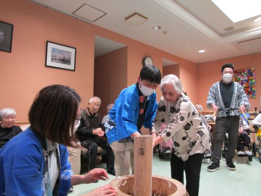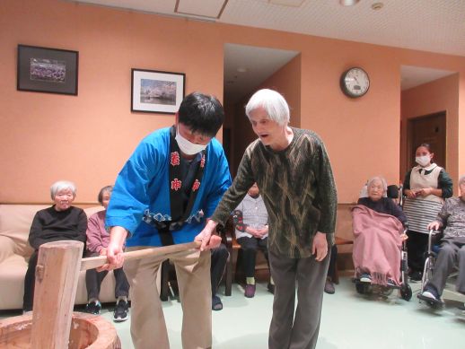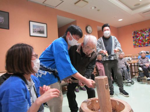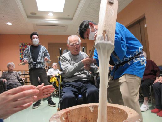 いざ餅つきが始まると「よいしょ~」と大きな声で掛け声を出してくれ、時間の許す限り参加してもらい皆様で楽しみました♪