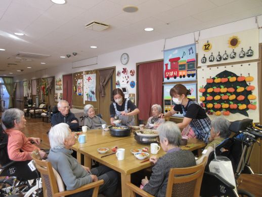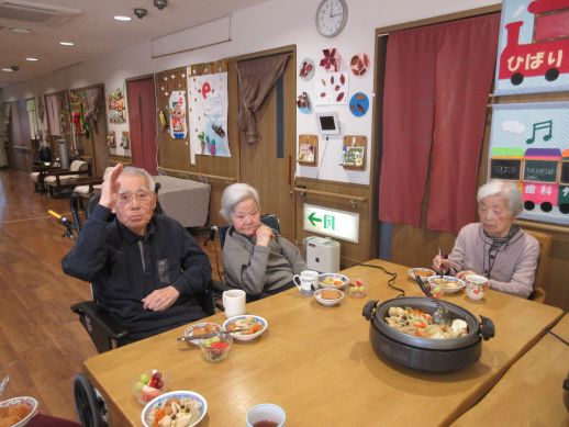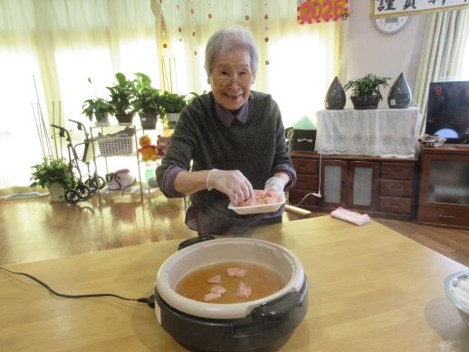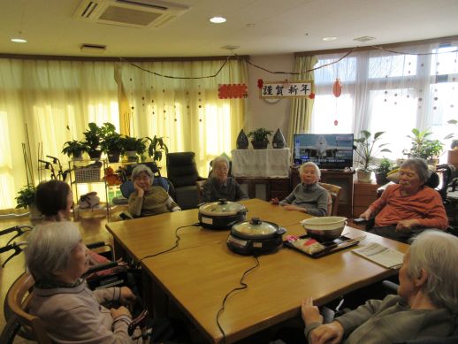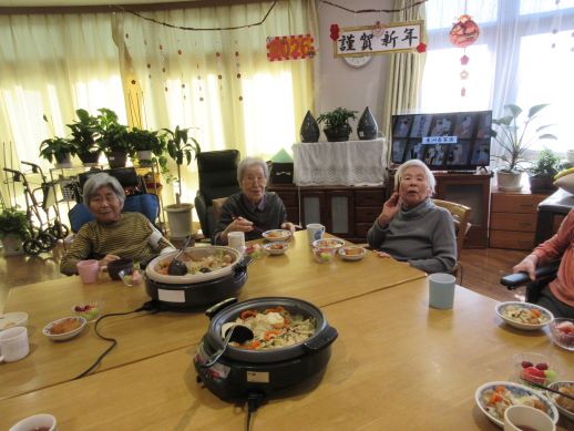 各自担当で野菜を切って頂いたり、いちごのヘタ取り、盛り付け等協力しながら完成しました。煮込んでいる最中は一人ひとり今年の反省、思い、来年の思いを発表して頂きました。皆さん『健康第一』ですね♪