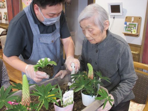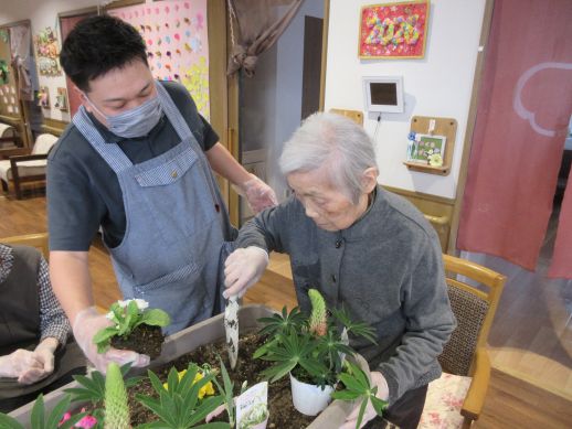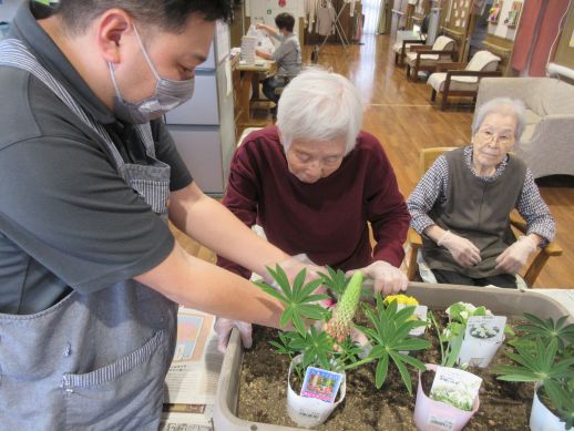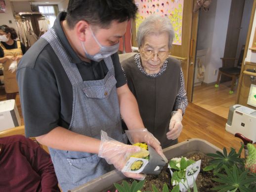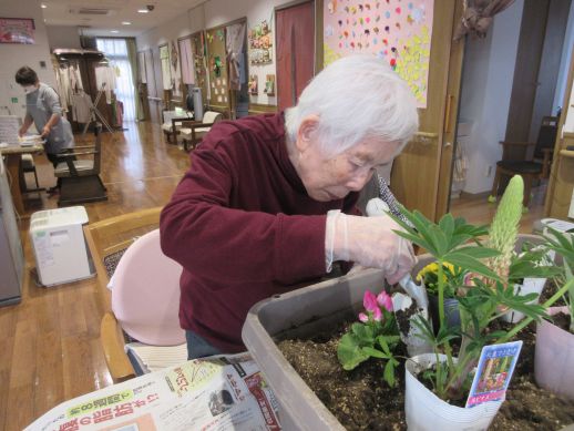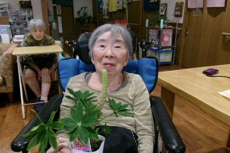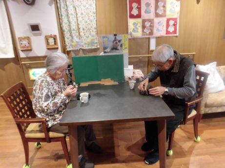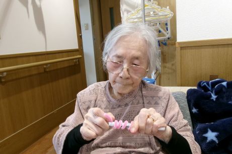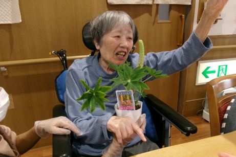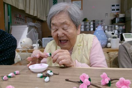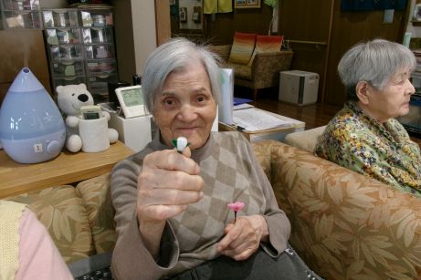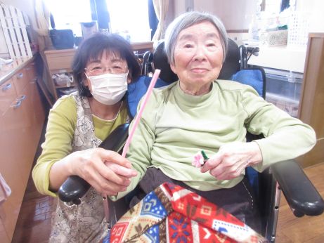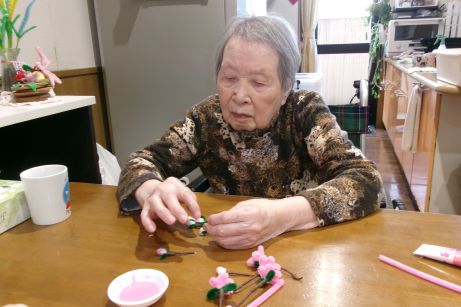 ひねったら出来上がり~。皆さん楽しそうです♪原木に花びらを飾るのが難しかったようですが一足早く満開の桜を観ることができユニット内は春爛漫♪