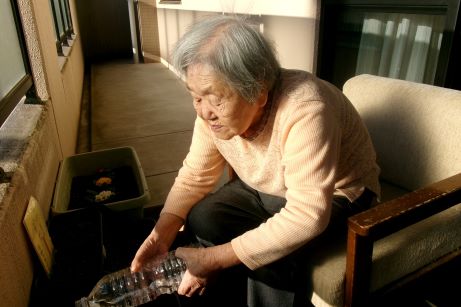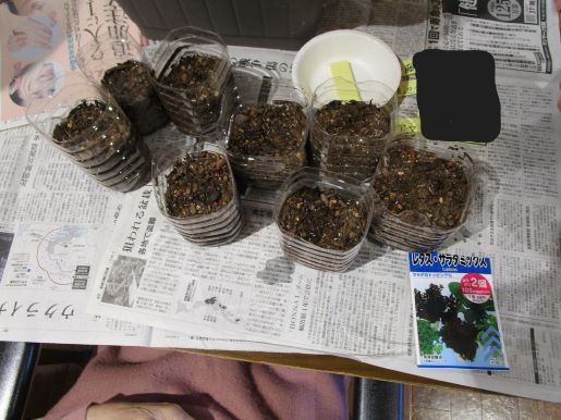 ペットボトルを半分に切って、その中に土をいて上から種をまきました。