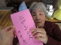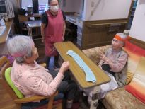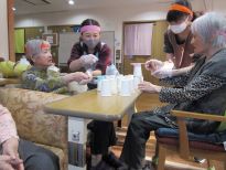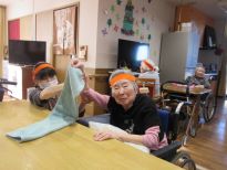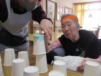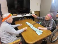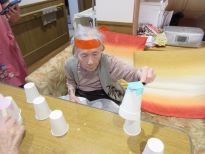 ジャンケンで勝った方がタオルを取れば1点!負けたのにタオルを取ってしまうと相手に1点のペナルティー。夢中になりすぎて勝ったか負けたか分からなくなって皆で大笑いしちゃいました☆次のもぐらたたきゲームではマイペースにゲームを楽しみたい方と応援に熱が入る方、勝負にこだわる方がいて皆で愉快に盛り上がりました♪