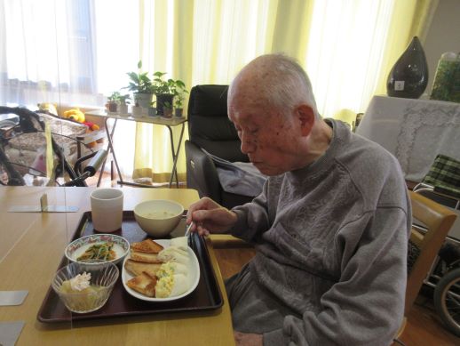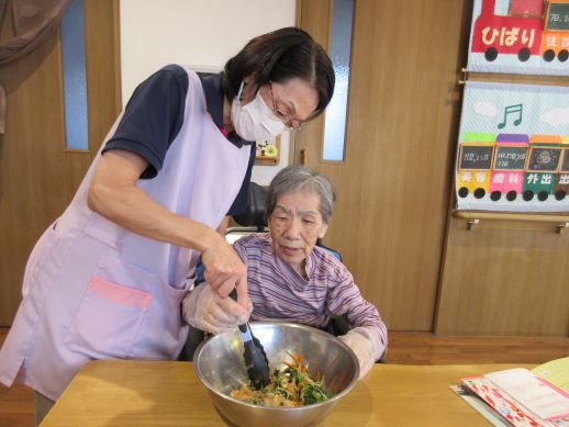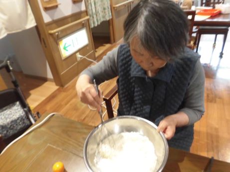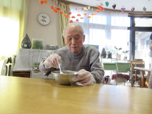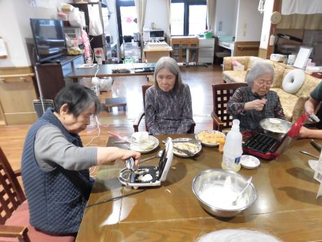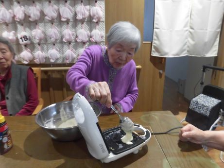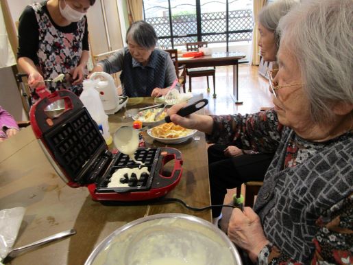 ワッフル作りをおこないました。ワッフル作りますと声を掛けるも、ワッフルとは?うまく出来るの?などの声が上がるも皆さんで協力して作ってみましょう~!