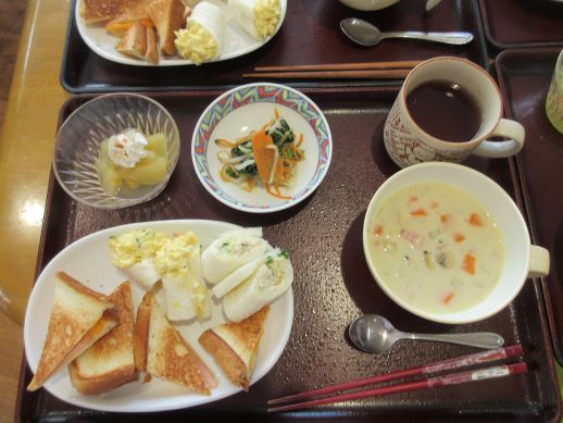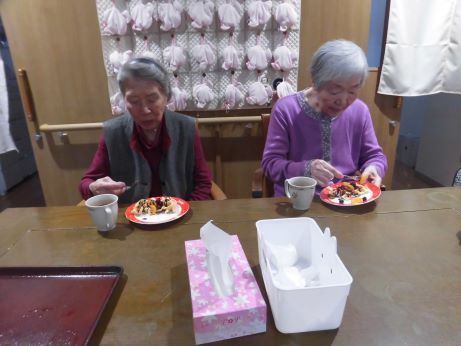 生地はホットケーキの素、ワッフルメーカーに生地を流し、しばらくすると、良い香りが、出来たかな?と言いながら覗くと生地は張り付き上手く取れなくボロボロになってしまいました。難しいねと2回目、3回目と行っていくうちにコツを見つけ何とか4回目でワッフルになりました。焼き上がったワッフルのトッピングを行い皆さんで美味しくいただきました☆