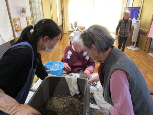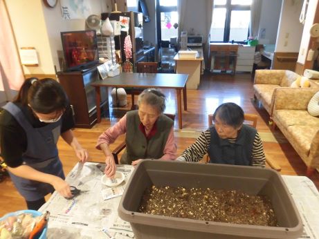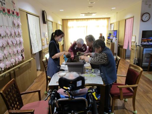 グループホーム中の郷では、年間を通じてたくさんのイベント・行事を開催しています。毎月の季節行事以外にも、誕生会やフラワーセラピー、書道、オカリナ教室などを月1~2回開催しています。