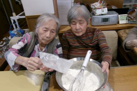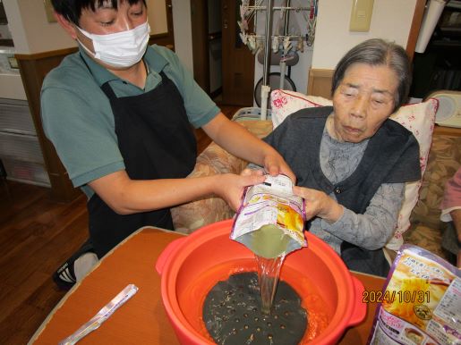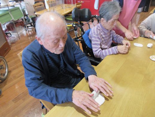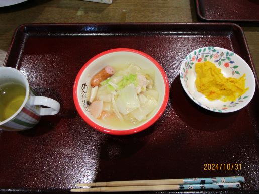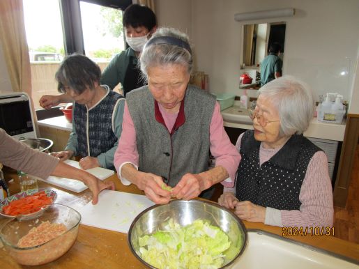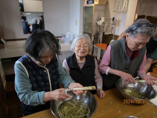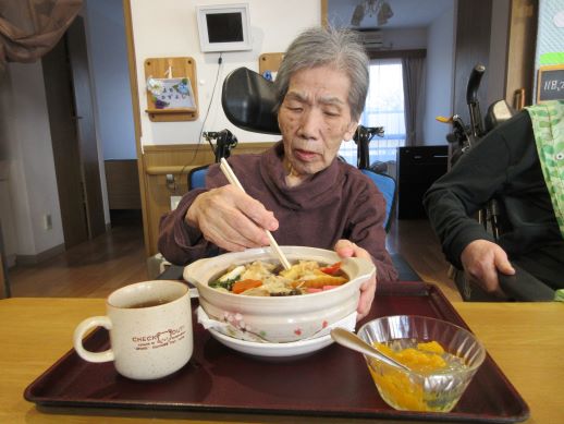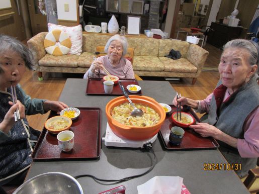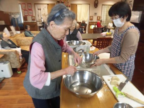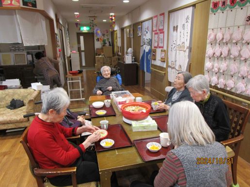 皆様に何が食べたいかと相談しているとすいとんが食べたい!との事で今回はすいとん鍋に決まりました♪野菜を切ってもらったり、すいとんの生地を作ってもらったりと皆様にも手伝ってもらいあっという間に完成しました♪1つでは物足りないとの声もあり醤油味と塩味の2種類を用意し皆様たくさん召し上がっていました♪寒くなってきたので鍋がいいね♪など会話も弾んでいました☆