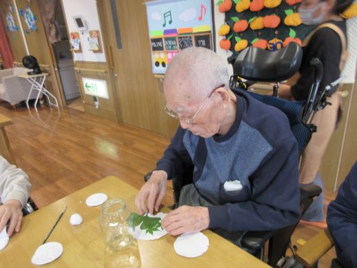 イチョウやもみじの葉っぱを使い秋を感じる飾りが出来上がりました☆