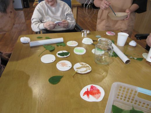 そこに、拾ってきた落ち葉などを貼ったり型を取ったりして絵の具で色付けしました!