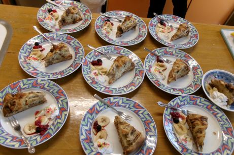 バナナがたっぷり入ったパウンドケーキ作りに挑戦しました!このまま食べちゃおうかな~?なんて言いながらバナナの皮むきをして生地に混ぜオーブンでじっくりと1時間焼きました。甘い香りに包まれながら「美味しく焼けるといいね」と皆さん時計とにらめっこ。1時間待った甲斐があって美味しく焼けました☆あっという間に食べ終わりました♪