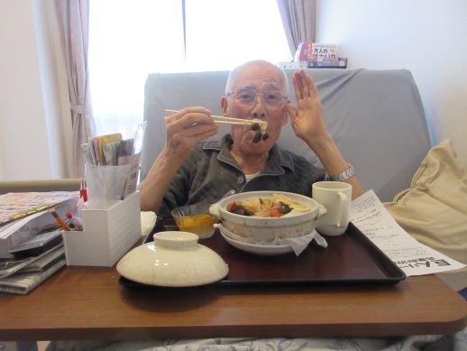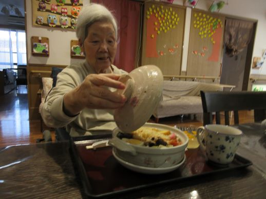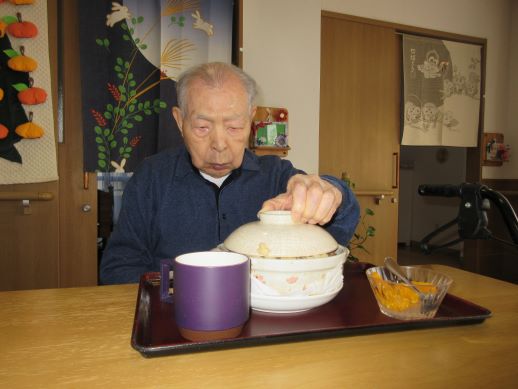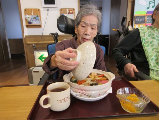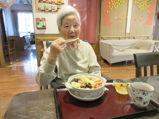 急に寒くなってきたので、今月の出前は鍋焼きうどんにしました!のぞき込むように蓋を取り「わーすごい」と喜ばれていました☆