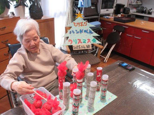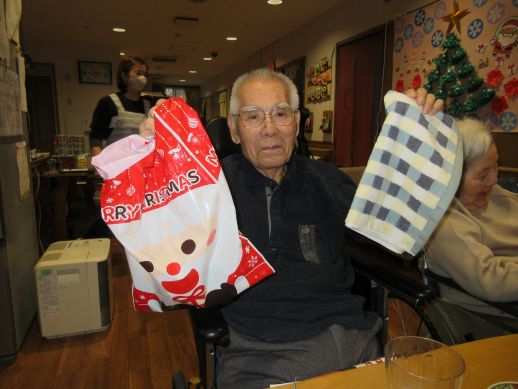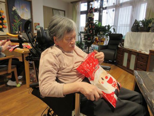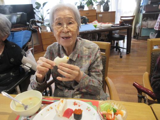 チキン、シチュー、ポテトフライ、手まり寿司、フルーツサンドなど用意し、シャンメリーで乾杯しました。スタッフによるハンドベルやロウソク灯しゲームを行い、ケーキとプレゼントにとても喜んでいただきました♪