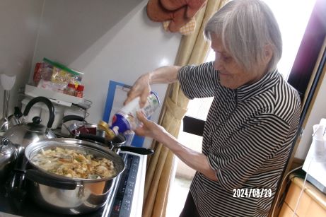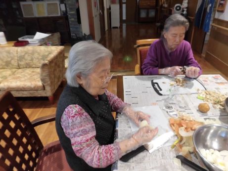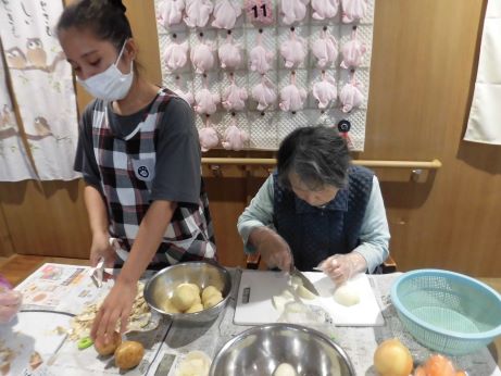 『うちではりんごを入れたよ、隠し味にコーヒーを入れてたよ~』など情報交換しながら、玉ねぎ、人参、ジャガイモを見事な包丁さばきであっという間に一口大にしていました!