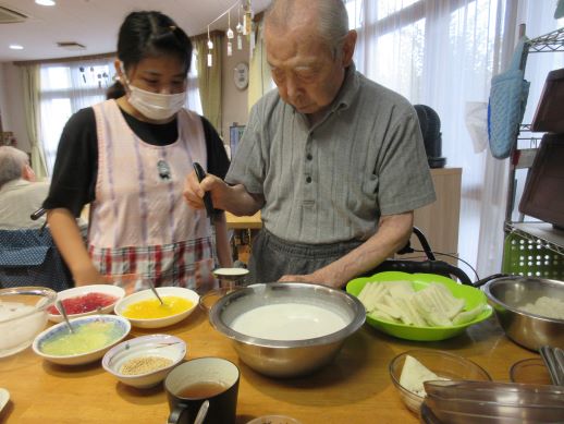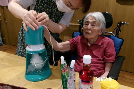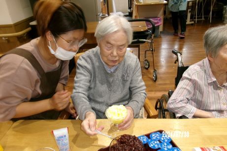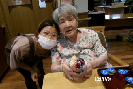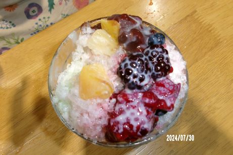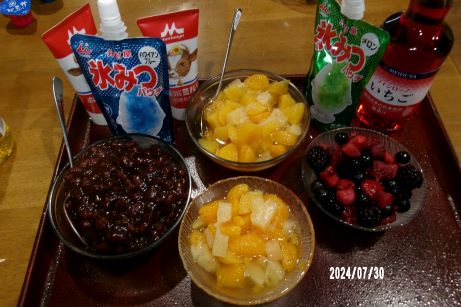 夏の風物詩といえば冷たいかき氷が浮かんできますね。猛暑続きなので今日はかき氷を作ろうよ!「アイスものせる?」「あずきもいいね」「フルーツも~」なんて言いながら全部トッピングしちゃいました♪昔を思い出しながらグルグル回して氷を削るのがとっても楽しかったです☆食べたら頭にキーン!これもいい思い出になりました。