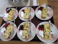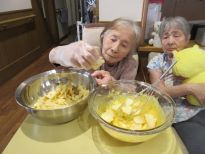 リンゴとレーズンのケーキを焼いて生クリームやベリーをトッピングしてオシャレなおやつタイムを過ごしました☆生地を丁寧に混ぜると美味しく焼けるそうなので何度も何度も混ぜました。頑張った甲斐があり上品に焼き上がって「ケーキ屋さんみたいにできたね」と皆さん大満足☆もちろんお味もgoodでした♪