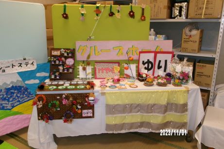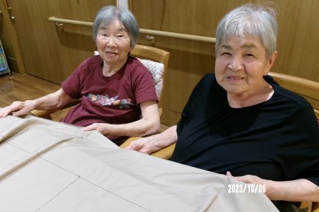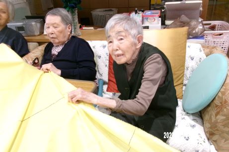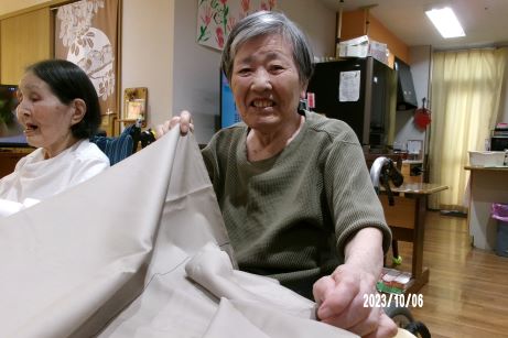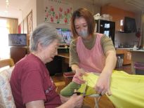 今年はユニットの暖簾を新しくしよう!ということで生地の色やデザインを皆で考えて「もう少しこっちだよ~」「しっかり持っててね~」なんて言いながら採寸や裁断をして縫い合わせる準備をしました♪レモン色とカフェオレ色のやさしい色味を組み合わせてビーズを付けたらユニット内が明るい雰囲気になって皆さんお気に入り作品が完成しました♪
