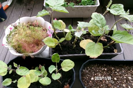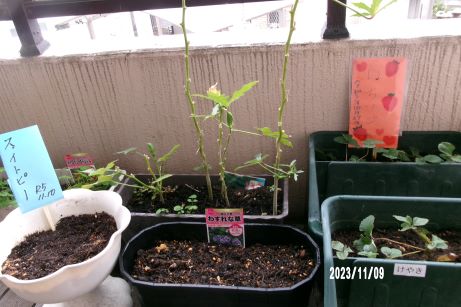 10月に植えたイチゴの苗に新芽が増えてきて茎より少し離れたところに肥料を蒔くともっと元気になると教えてもらい早速蒔きました。そして2ヶ月間私達を楽しませてくれた「るこう草」の花時とナスの時期が終えたので片付けをしてスイトピーとわすれな草の種を蒔きました☆開花は来年3月頃のようなので皆で見守っていきたいと思います♪